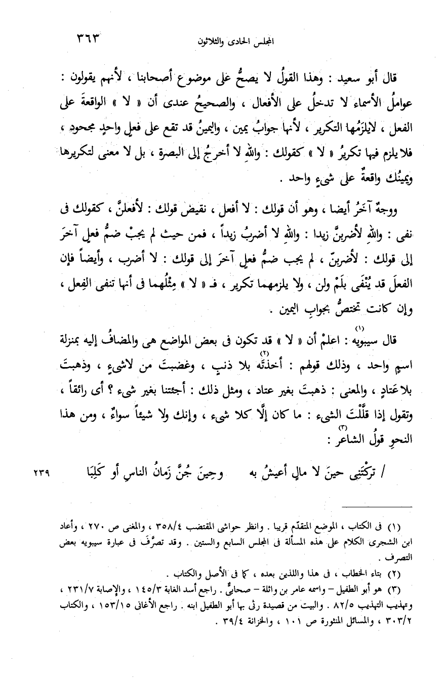 (¬1) فى الكتاب، الموضع المتقدّم قريبا. وانظر حواشى المقتضب 4/ 358، والمغنى ص 270، وأعاد ابن الشجرى الكلام على هذه المسألة فى المجلس السابع والستين. وقد تصرّف فى عبارة سيبويه بعض التصرف.