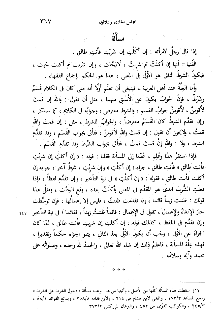 فإذا استقرّ هذا وعلم، عدنا إلى المسألة فقلنا: قوله: «إن أكلت إن شربت فأنت طالق» فأنت طالق، جزاء «إن أكلت» وإن شربت، شرط آخر، جوابه إن أكلت فأنت طالق، فقوله: «إن أكلت» فى نية التأخير، وإن تقدّم لفظا، فإذا فعلت الشّرب الذى هو المقدّم فى المعنى وأكلت بعده، وقع الحنث، ومثل هذا قولك: ظننت زيدا قائما، إذا تقدمت ظننت، فليس إلا إعمالها، فإن توسّطت جاز الإلغاء والإعمال، تقول فى الإعمال: قائما ظننت زيدا، فقائما/فى نية التأخير وإن تقدّم فى اللفظ، كذلك قوله: إن أكلت إن شربت فأنت طالق، لمّا كان الجزاء عن الأول، وجب أن يكون الأول بعد الثانى، يتلو الجزاء حكما وتقديرا، فهذه علّة المسألة، فاعلم ذلك إن شاء الله تعالى، والحمد لله وحده، وصلواته على محمد وآله وسلامه.