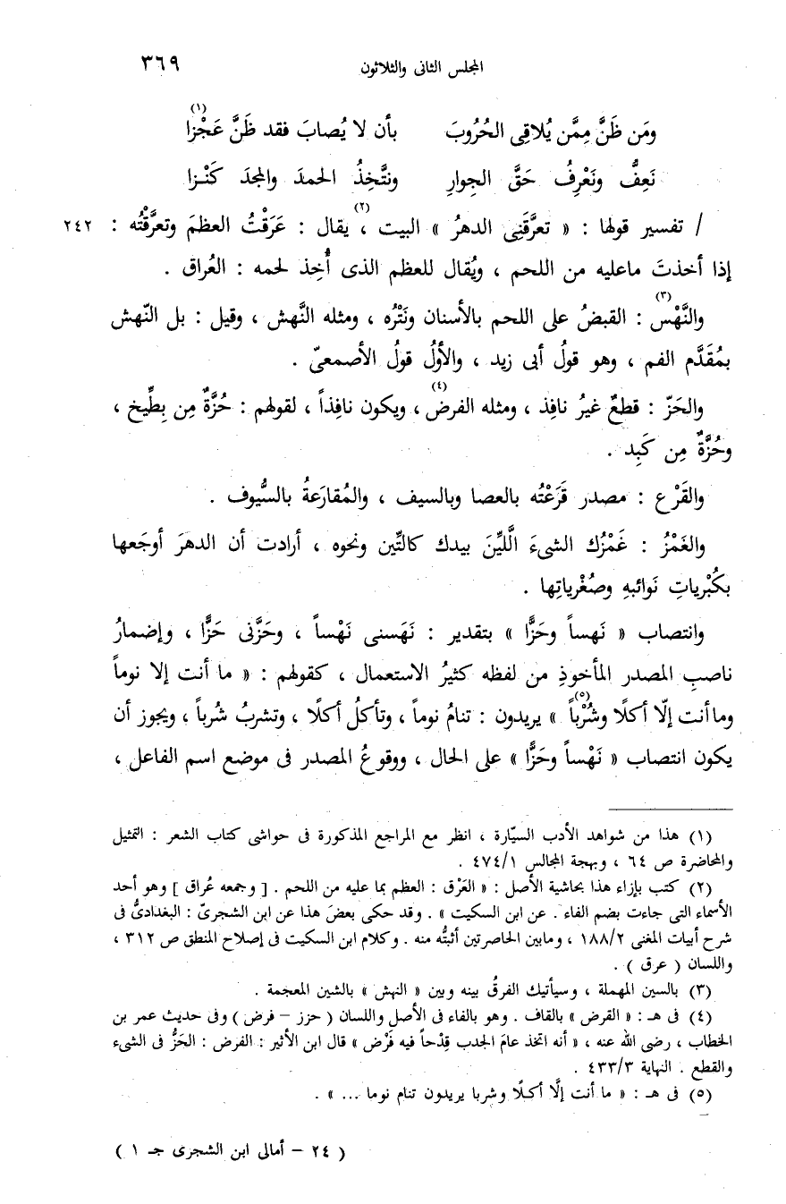 وانتصاب «نهسا وحزّا» بتقدير: نهسنى نهسا، وحزّنى حزّا، وإضمار ناصب المصدر المأخوذ من لفظه كثير الاستعمال، كقولهم: «ما أنت إلا نوما وما أنت إلاّ أكلا وشربا (¬5)» يريدون: تنام نوما، وتأكل أكلا، وتشرب شربا، ويجوز أن يكون انتصاب «نهسا وحزّا» على الحال، ووقوع المصدر فى موضع اسم الفاعل،