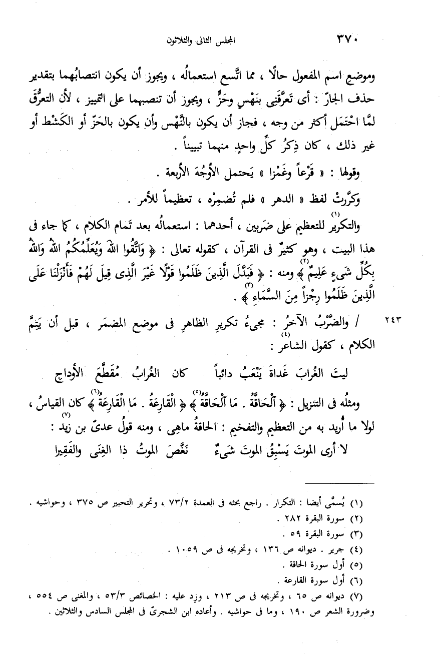 (¬7) ديوانه ص 65، وتخريجه فى ص 213، وزد عليه: الخصائص 3/ 53، والمغنى ص 554، وضرورة الشعر ص 190، وما فى حواشيه. وأعاده ابن الشجرىّ فى المجلس السادس والثلاثين.