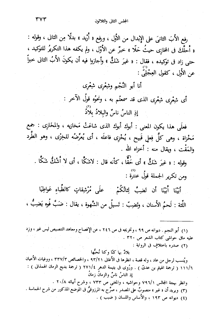 «أحلّك فى المخازى حيث حلاّ» خبر عن الأوّل، ولم يكفه هذا التكرير للتوكيد، حتى زاد فى توكيده، فقال: «غير شكّ» وأجازوا فيه أن يكون الأب الثانى خبرا عن الأول، كقول العجلىّ (¬1):