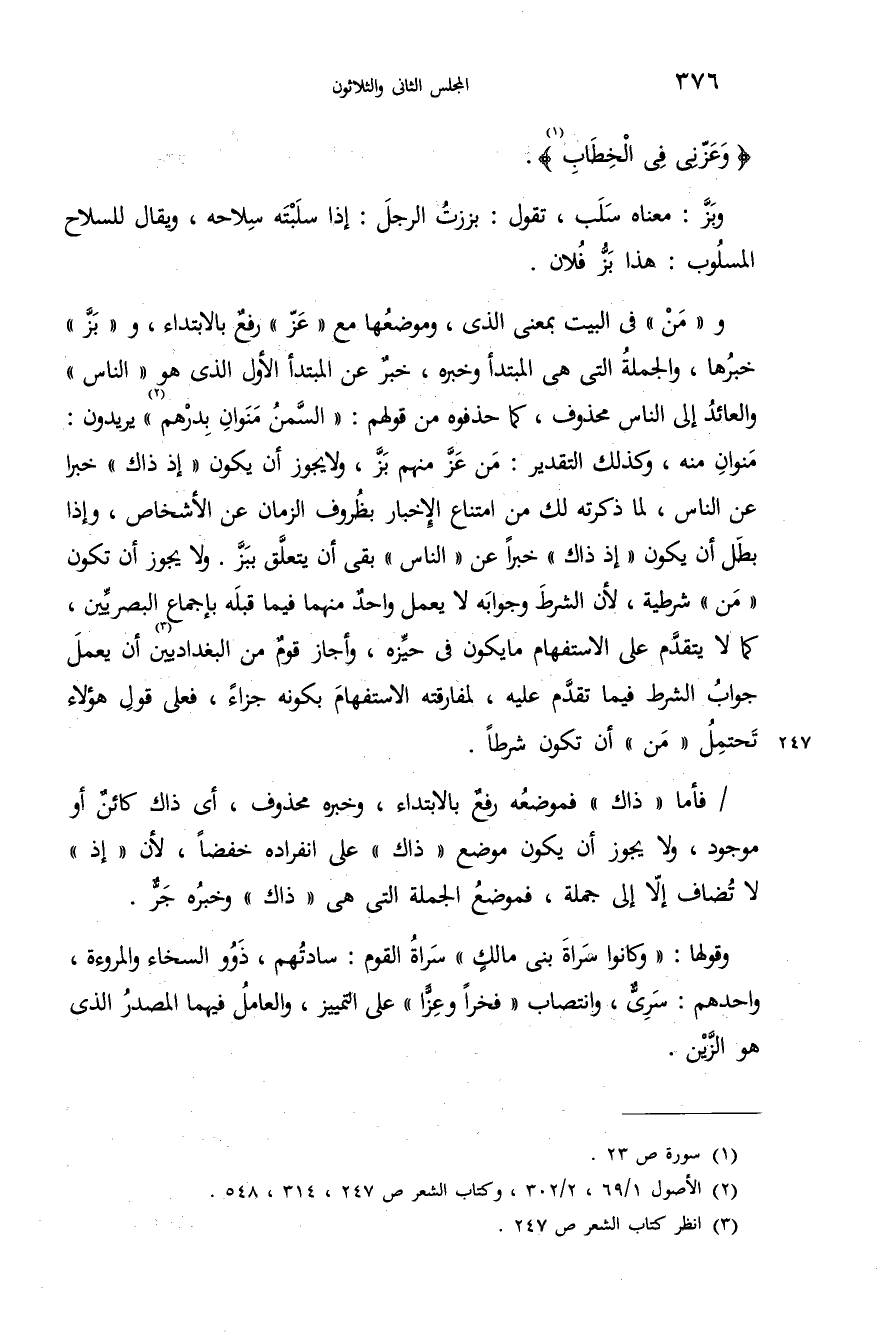 و «من» فى البيت بمعنى الذى، وموضعها مع «عزّ» رفع بالابتداء، و «بزّ» خبرها، والجملة التى هى المبتدأ وخبره، خبر عن المبتدأ الأول الذى هو «الناس» والعائد إلى الناس محذوف، كما حذفوه من قولهم: «السّمن منوان بدرهم (¬2)» يريدون: