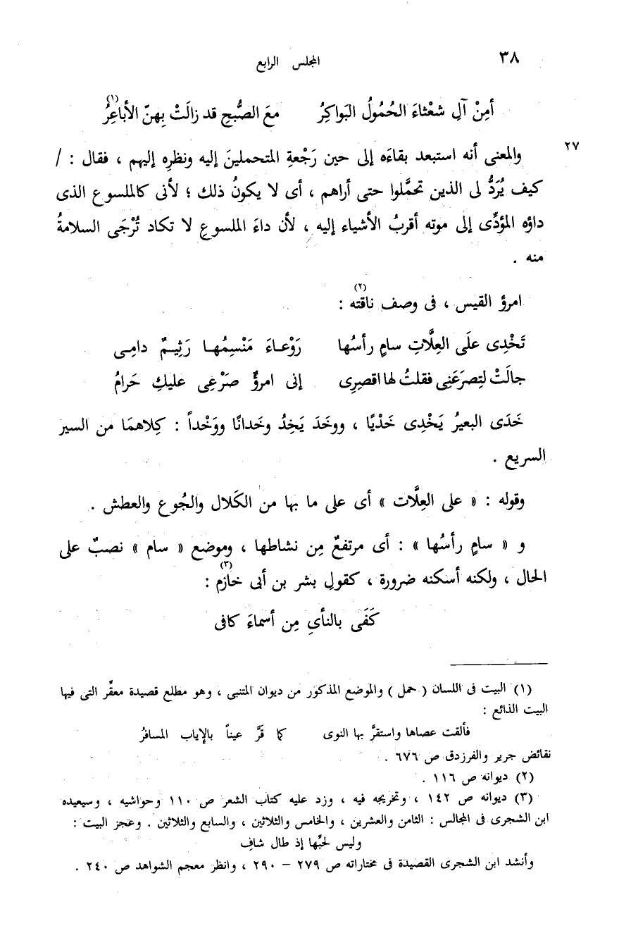 (¬3) ديوانه ص 142، وتخريجه فيه، وزد عليه كتاب الشعر ص 110 وحواشيه، وسيعيده ابن الشجرى فى المجالس: الثامن والعشرين، والخامس والثلاثين، والسابع والثلاثين. وعجز البيت: وليس لحبّها إذ طال شاف وأنشد ابن الشجرى القصيدة فى مختاراته ص 279 - 290، وانظر معجم الشواهد ص 240.