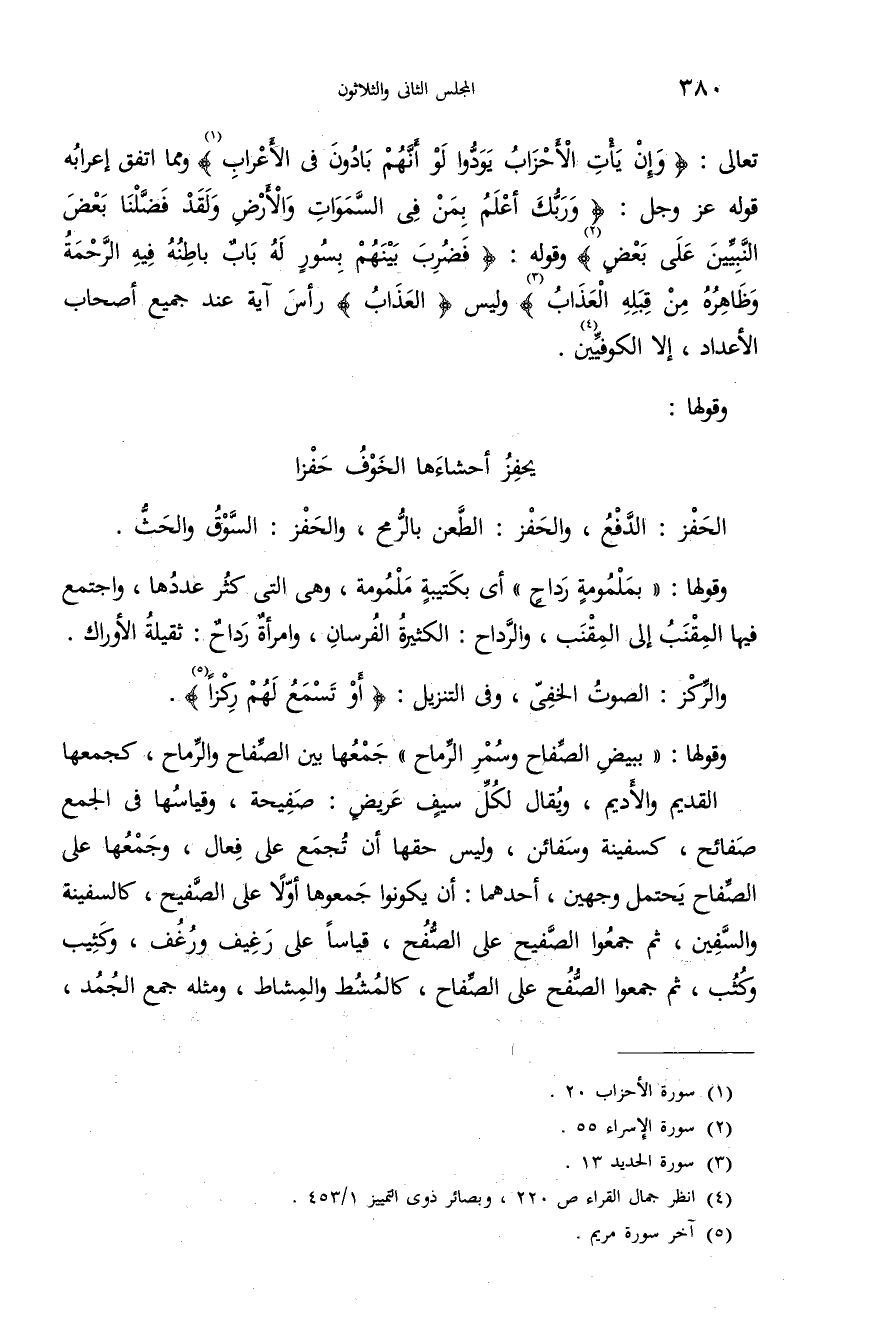 وقولها: «ببيض الصّفاح وسمر الرّماح» جمعها بين الصّفاح والرّماح، كجمعها القديم والأديم، ويقال لكلّ سيف عريض: صفيحة، وقياسها فى الجمع صفائح، كسفينة وسفائن، وليس حقها أن تجمع على فعال، وجمعها على الصّفاح يحتمل وجهين، أحدهما: أن يكونوا جمعوها أوّلا على الصّفيح، كالسفينة والسّفين، ثم جمعوا الصّفيح على الصّفح، قياسا على رغيف ورغف، وكثيب وكثب، ثم جمعوا الصّفح على الصّفاح، كالمشط والمشاط، ومثله جمع الجمد،