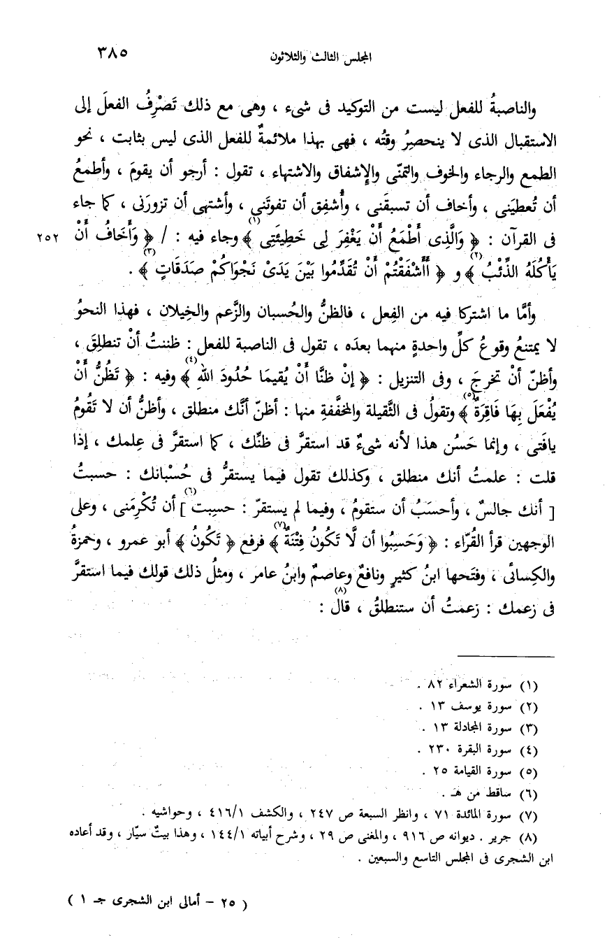 والناصبة للفعل ليست من التوكيد فى شيء، وهى مع ذلك تصرف الفعل إلى الاستقبال الذى لا ينحصر وقته، فهى بهذا ملائمة للفعل الذى ليس بثابت، نحو الطمع والرجاء والخوف والتمنّى والإشفاق والاشتهاء، تقول: أرجو أن يقوم، وأطمع أن تعطينى، وأخاف أن تسبقنى، وأشفق أن تفوتنى، وأشتهى أن تزورنى، كما جاء فى القرآن: {وَالَّذِي أَطْمَعُ أَنْ يَغْفِرَ لِي خَطِيئَتِي} (¬1) وجاء فيه: / {وَأَخافُ أَنْ يَأْكُلَهُ الذِّئْبُ} (¬2) و {أَأَشْفَقْتُمْ أَنْ تُقَدِّمُوا بَيْنَ يَدَيْ نَجْواكُمْ صَدَقاتٍ} (¬3).