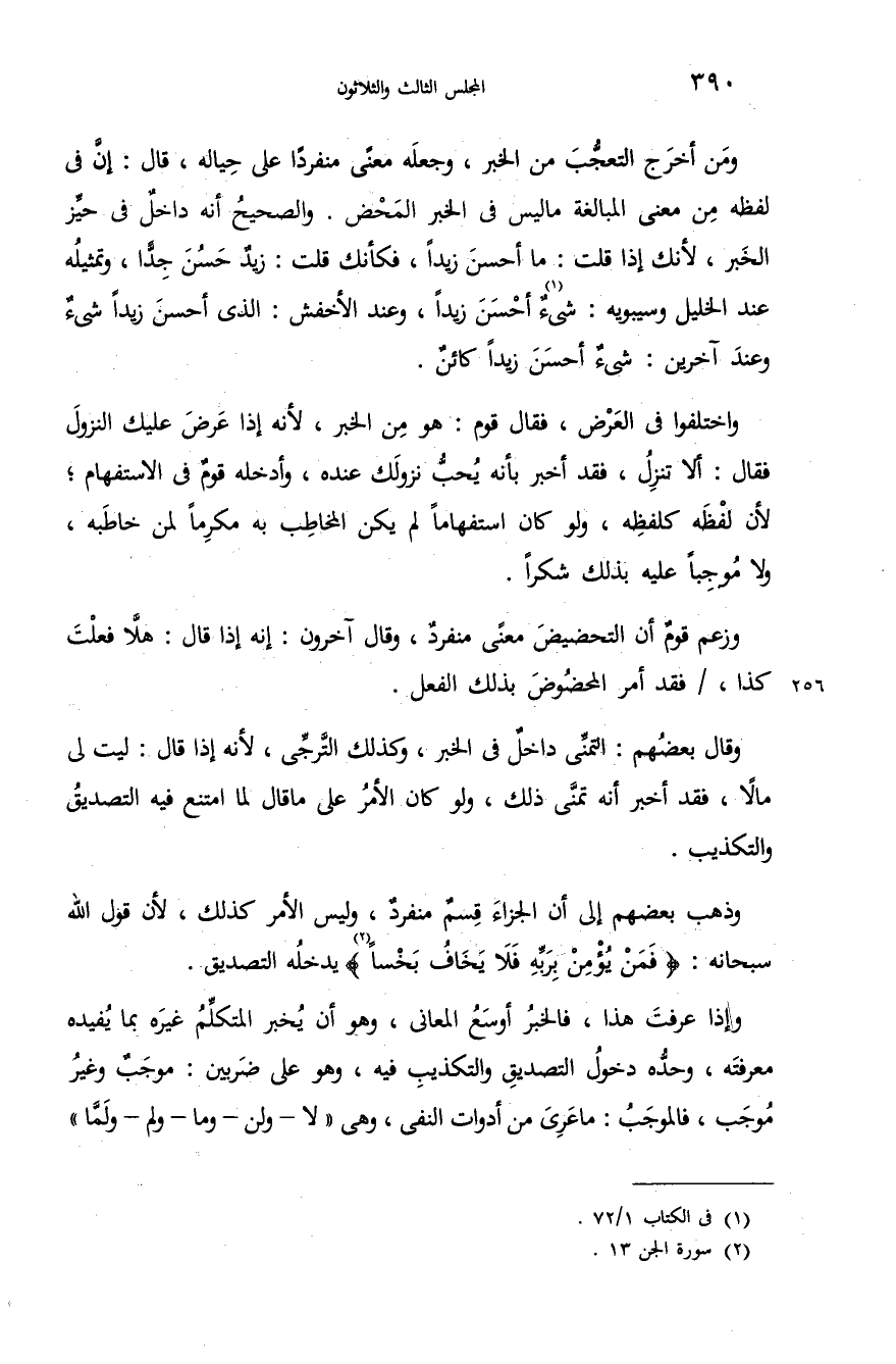 وقال بعضهم: التمنّى داخل فى الخبر، وكذلك التّرجّى، لأنه إذا قال: ليت لى مالا، فقد أخبر أنه تمنّى ذلك، ولو كان الأمر على ما قال لما امتنع فيه التصديق والتكذيب.