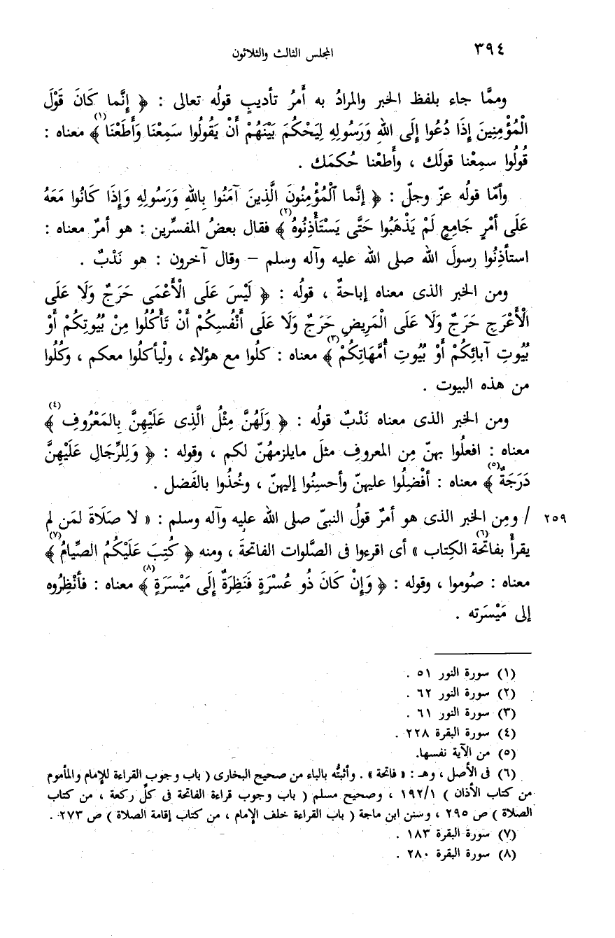 وأمّا قوله عزّ وجلّ: {إِنَّمَا الْمُؤْمِنُونَ الَّذِينَ آمَنُوا بِاللهِ وَرَسُولِهِ وَإِذا كانُوا مَعَهُ عَلى أَمْرٍ جامِعٍ لَمْ يَذْهَبُوا حَتّى يَسْتَأْذِنُوهُ} (¬2) فقال بعض المفسّرين: هو أمر معناه: