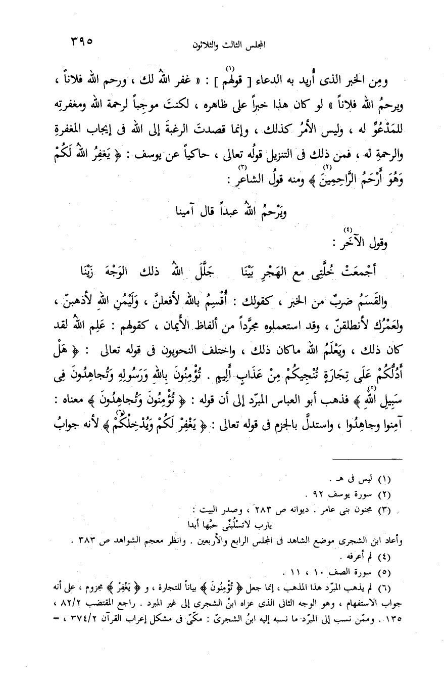 (¬6) لم يذهب المبرّد هذا المذهب، إنما جعل تُؤْمِنُونَ بيانا للتجارة، ويَغْفِرْ مجزوم، على أنه جواب الاستفهام، وهو الوجه الثانى الذى عزاه ابن الشجرى إلى غير المبرد. راجع المقتضب 2/ 82، 135. وممّن نسب إلى المبرّد ما نسبه إليه ابن الشجرىّ: مكّىّ فى مشكل إعراب القرآن 2/ 374، -