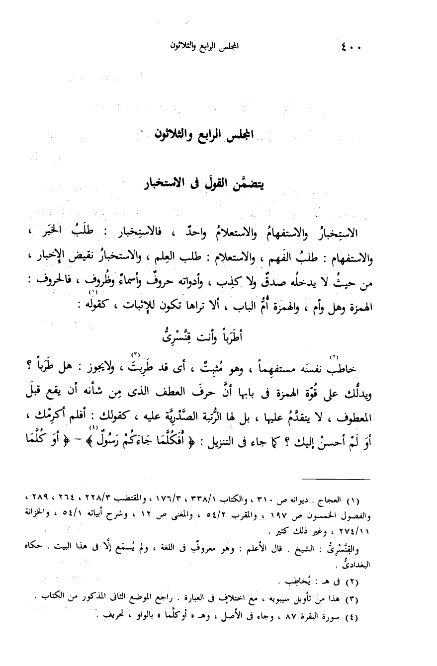 خاطب (¬2) نفسه مستفهما، وهو مثبت، أى قد طربت (¬3)، ولا يجوز: هل طربا؟ ويدلّك على قوّة الهمزة فى بابها أنّ حرف العطف الذى من شأنه أن يقع قبل المعطوف، لا يتقدّم عليها، بل لها الرّتبة الصّدريّة عليه، كقولك: أفلم أكرمك، أولم أحسن إليك؟ كما جاء فى التنزيل: {أَفَكُلَّما جاءَكُمْ رَسُولٌ} (¬4) - {أَوَكُلَّما}