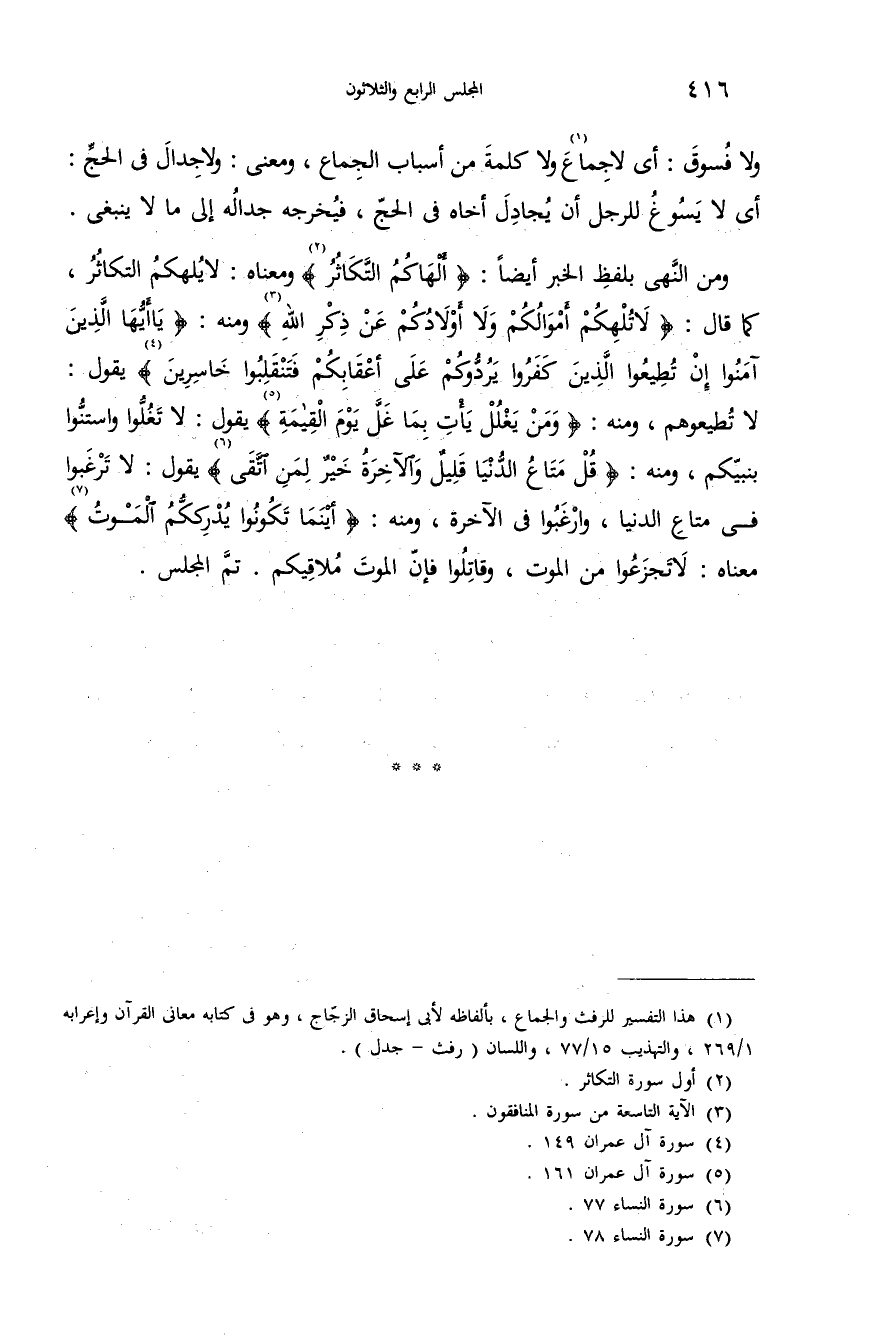 لا تطيعوهم، ومنه: {وَمَنْ يَغْلُلْ يَأْتِ بِما غَلَّ يَوْمَ الْقِيامَةِ} (¬5) يقول: لا تغلّوا واستنّوا بنبيّكم، ومنه: {قُلْ مَتاعُ الدُّنْيا قَلِيلٌ وَالْآخِرَةُ خَيْرٌ لِمَنِ اِتَّقى} (¬6) يقول: لا ترغبوا فى متاع الدنيا، وارغبوا فى الآخرة، ومنه: {أَيْنَما تَكُونُوا يُدْرِكْكُمُ الْمَوْتُ} (¬7) معناه: لا تجزعوا من الموت، وقاتلوا فإنّ الموت ملاقيكم. تمّ المجلس.