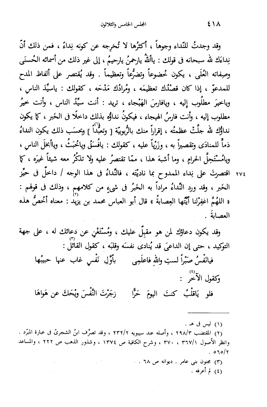 وقد يكون دعاؤك لمن هو مقبل عليك، ومستغن عن دعائك له، على جهة التوكيد، حتى إن الداعى قد ينادى نفسه وقلبه، كقول القائل (¬3):