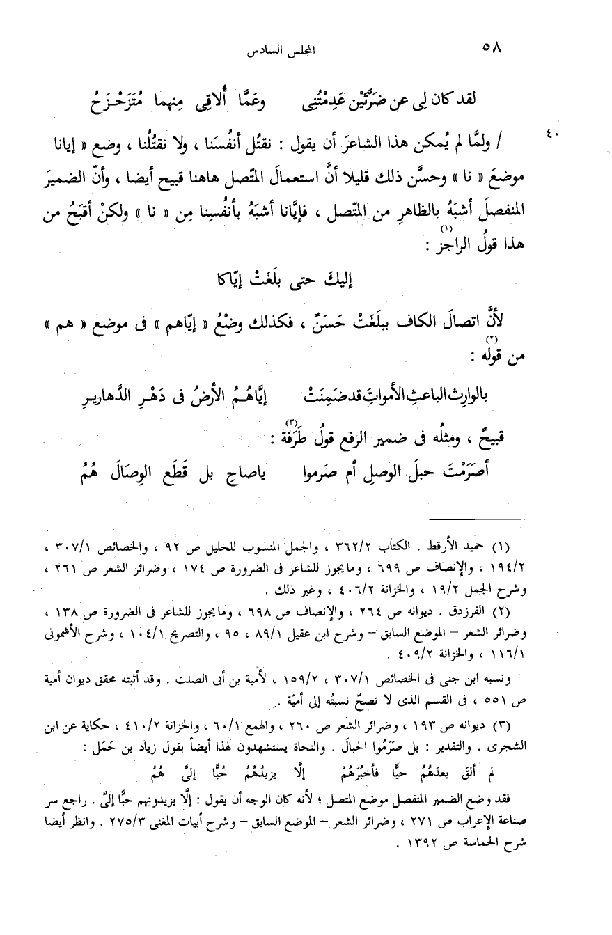 /ولمّا لم يمكن هذا الشاعر أن يقول: نقتل أنفسنا، ولا نقتلنا، وضع «إيانا موضع «نا» وحسّن ذلك قليلا أنّ استعمال المتّصل هاهنا قبيح أيضا، وأنّ الضمير المنفصل أشبه بالظاهر من المتّصل، فإيّانا أشبه بأنفسنا من «نا» ولكن أقبح من هذا قول الراجز (¬1):
