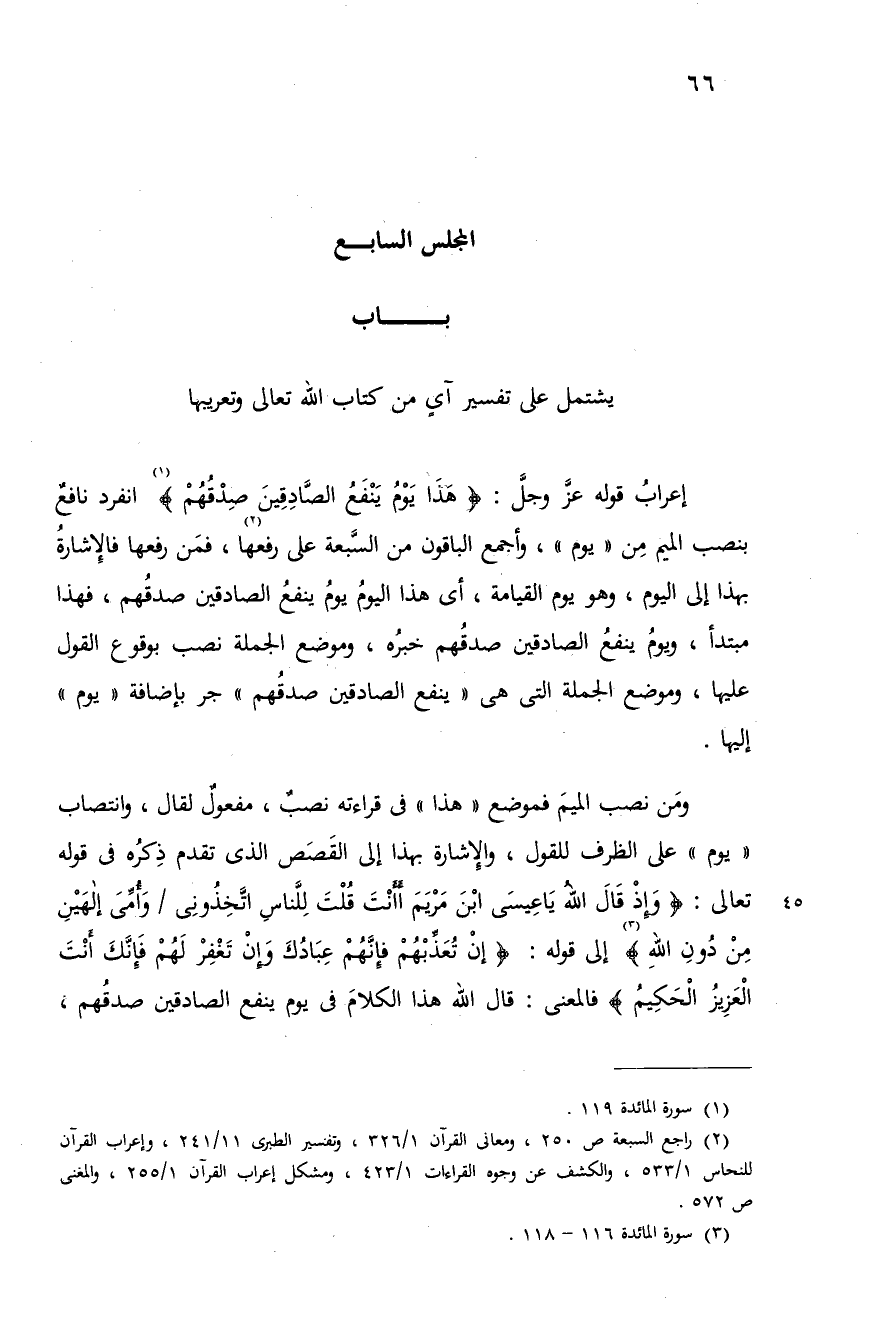 ومن نصب الميم فموضع «هذا» فى قراءته نصب، مفعول لقال، وانتصاب «يوم» على الظرف للقول، والإشارة بهذا إلى القصص الذى تقدم ذكره فى قوله تعالى: {وَإِذْ قالَ اللهُ يا عِيسَى اِبْنَ مَرْيَمَ أَأَنْتَ قُلْتَ لِلنّاسِ اِتَّخِذُونِي/وَأُمِّي إِلهَيْنِ مِنْ دُونِ اللهِ} (¬3) إلى قوله: {إِنْ تُعَذِّبْهُمْ فَإِنَّهُمْ عِبادُكَ وَإِنْ تَغْفِرْ لَهُمْ فَإِنَّكَ أَنْتَ الْعَزِيزُ الْحَكِيمُ} فالمعنى: قال الله هذا الكلام فى يوم ينفع الصادقين صدقهم،
