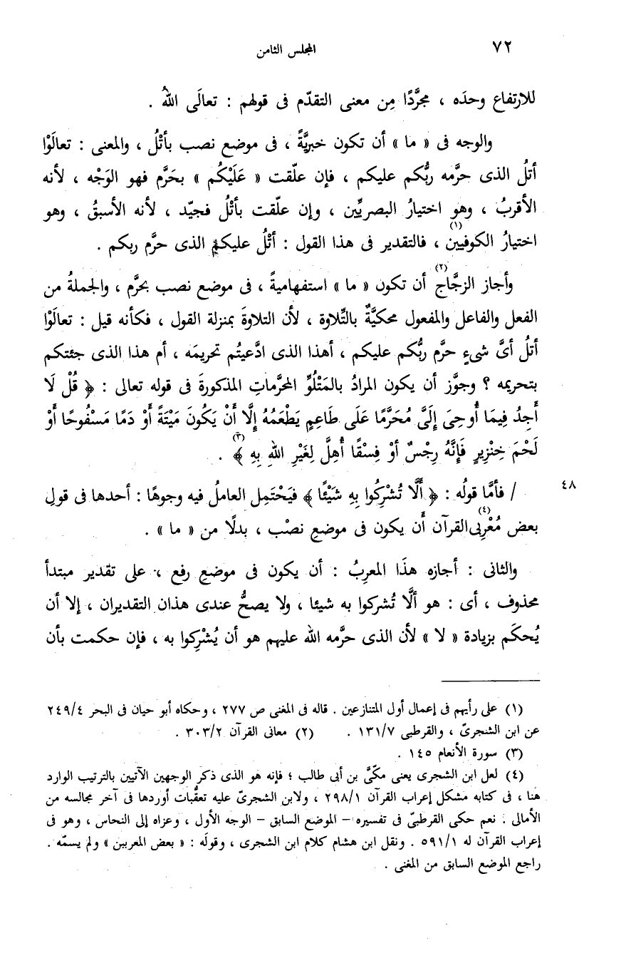 (¬4) لعل ابن الشجرى يعنى مكّىّ بن أبى طالب؛ فإنه هو الذى ذكر الوجهين الآتيين بالترتيب الوارد هنا، فى كتابه مشكل إعراب القرآن 1/ 298، ولابن الشجرىّ عليه تعقّبات أوردها فى آخر مجالسه من الأمالى. نعم حكى القرطبىّ فى تفسيره-الموضع السابق-الوجه الأول، وعزاه إلى النحاس، وهو فى إعراب القرآن له 1/ 591. ونقل ابن هشام كلام ابن الشجرى، وقوله: «بعض المعربين» ولم يسمّه. راجع الموضع السابق من المغنى.