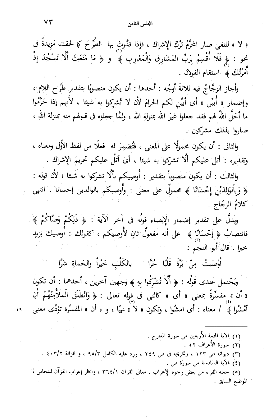 ويحتمل عندى قوله: {أَلاّ تُشْرِكُوا بِهِ} وجهين آخرين، أحدهما: أن تكون «أن» مفسّرة بمعنى «أى» كالتى فى قوله تعالى: {وَاِنْطَلَقَ الْمَلَأُ مِنْهُمْ أَنِ اِمْشُوا} (¬4) معناه: أى امشوا، وتكون «لا (¬5)» نهيا، و «أن» المفسّرة تؤدّى معنى
