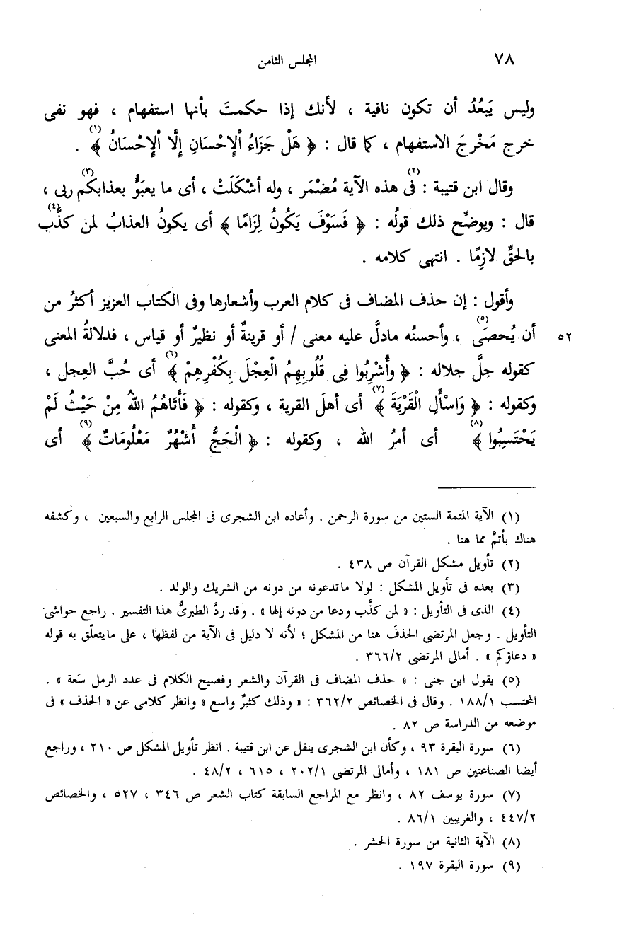 (¬6) سورة البقرة 93، وكأن ابن الشجرى ينقل عن ابن قتيبة. انظر تأويل المشكل ص 210، وراجع أيضا الصناعتين ص 181، وأمالى المرتضى 1/ 202،615،2/ 48.