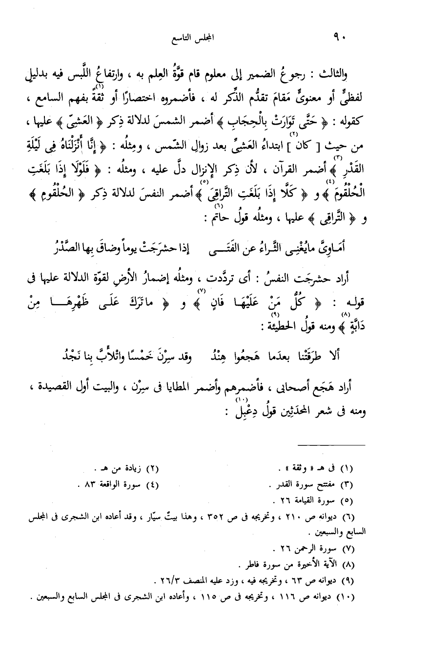 والثالث: رجوع الضمير إلى معلوم قام قوّة العلم به، وارتفاع اللّبس فيه بدليل لفظىّ أو معنوىّ مقام تقدّم الذّكر له، فأضمروه اختصارا أو ثقة (¬1) بفهم السامع، كقوله: {حَتّى تَوارَتْ بِالْحِجابِ} أضمر الشمس لدلالة ذكر {بِالْعَشِيِّ} عليها، من حيث [كان (¬2)] ابتداء العشىّ بعد زوال الشّمس، ومثله: {إِنّا أَنْزَلْناهُ فِي لَيْلَةِ الْقَدْرِ} (¬3) أضمر القرآن، لأن ذكر الإنزال دلّ عليه، ومثله: {فَلَوْلا إِذا بَلَغَتِ الْحُلْقُومَ} (¬4) و {كَلاّ إِذا بَلَغَتِ التَّراقِيَ} (¬5) أضمر النفس لدلالة ذكر {الْحُلْقُومَ} و {التَّراقِيَ} عليها، ومثله قول حاتم (¬6):