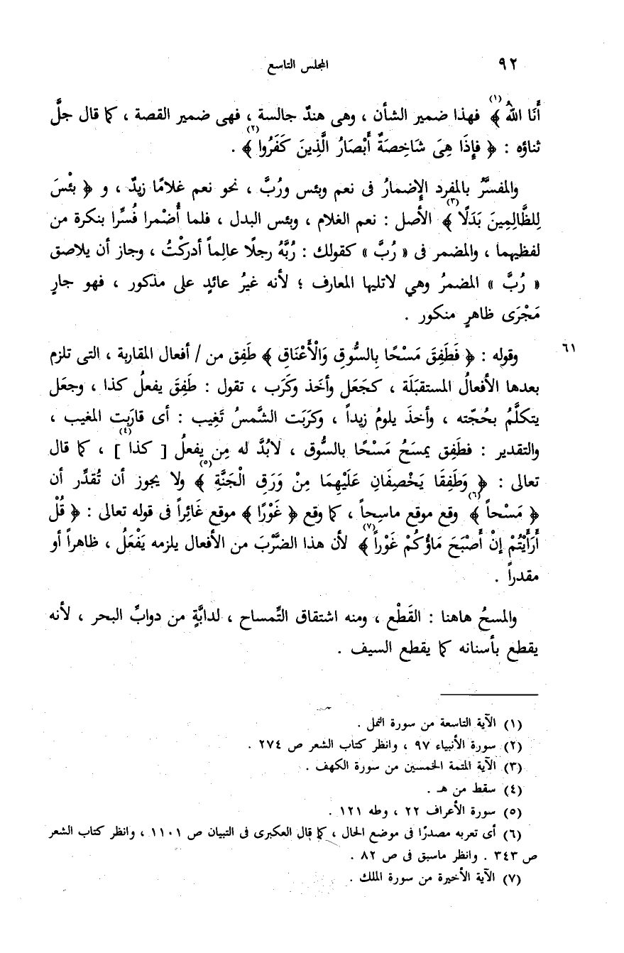 وقوله: {فَطَفِقَ مَسْحاً بِالسُّوقِ وَالْأَعْناقِ} طفق من/أفعال المقاربة، التى تلزم بعدها الأفعال المستقبلة، كجعل وأخذ وكرب، تقول: طفق يفعل كذا، وجعل يتكلّم بحجّته، وأخذ يلوم زيدا، وكربت الشّمس تغيب: أى قاربت المغيب، والتقدير: فطفق يمسح مسحا بالسّوق، لا بدّ له من يفعل [كذا (¬4)]، كما قال تعالى: {وَطَفِقا يَخْصِفانِ عَلَيْهِما مِنْ وَرَقِ الْجَنَّةِ} (¬5) ولا يجوز أن تقدّر أن {مَسْحاً} (¬6) وقع موقع ماسحا، كما وقع {غَوْراً} موقع غائرا فى قوله تعالى: {قُلْ أَرَأَيْتُمْ إِنْ أَصْبَحَ ماؤُكُمْ غَوْراً} (¬7) لأنّ هذا الضّرب من الأفعال يلزمه يفعل، ظاهرا أو مقدرا.