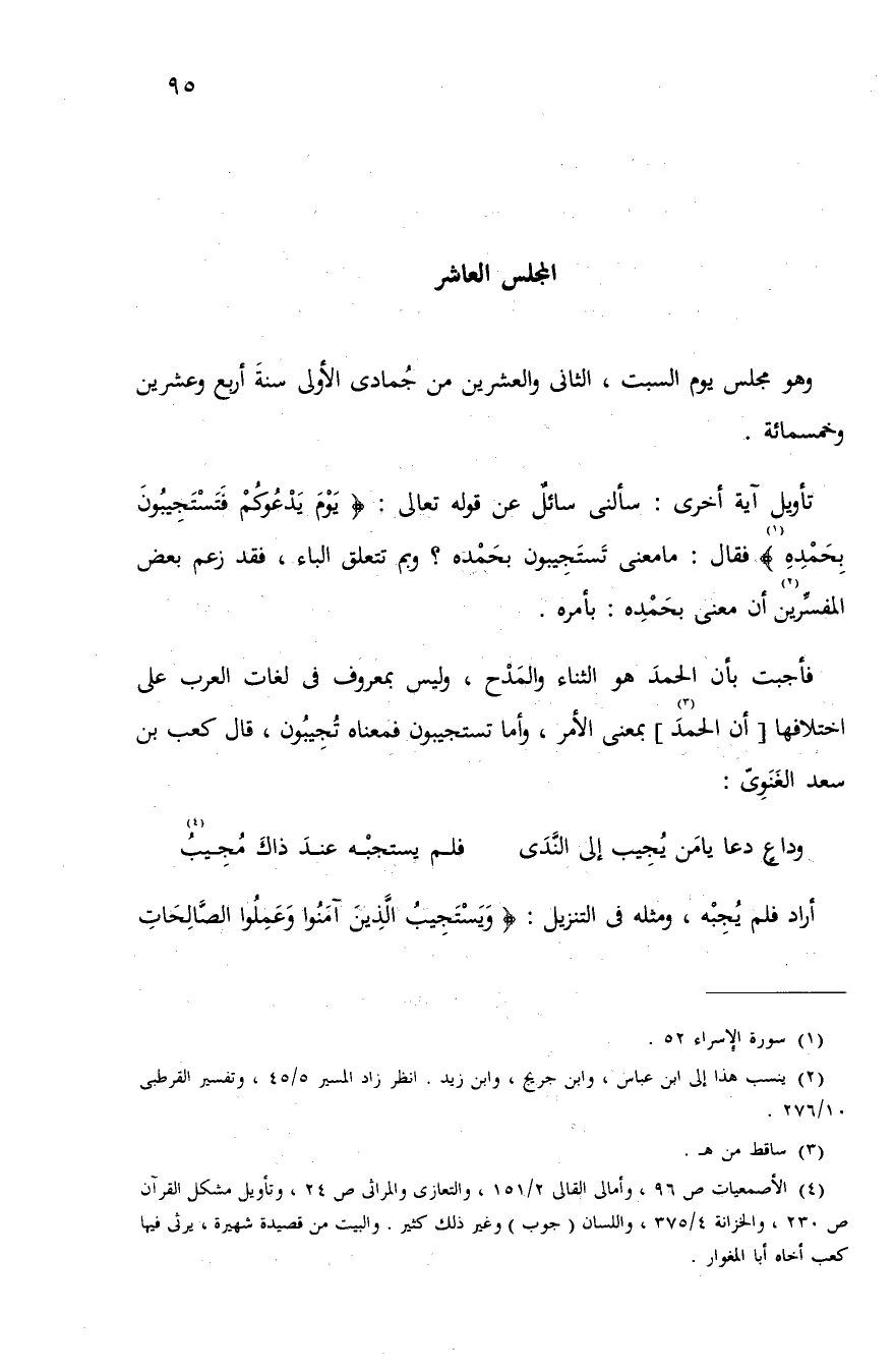 فأجبت بأن الحمد هو الثناء والمدح، وليس بمعروف فى لغات العرب على اختلافها [أن الحمد (¬3)] بمعنى الأمر، وأما تستجيبون فمعناه تجيبون، قال كعب بن سعد الغنوىّ: