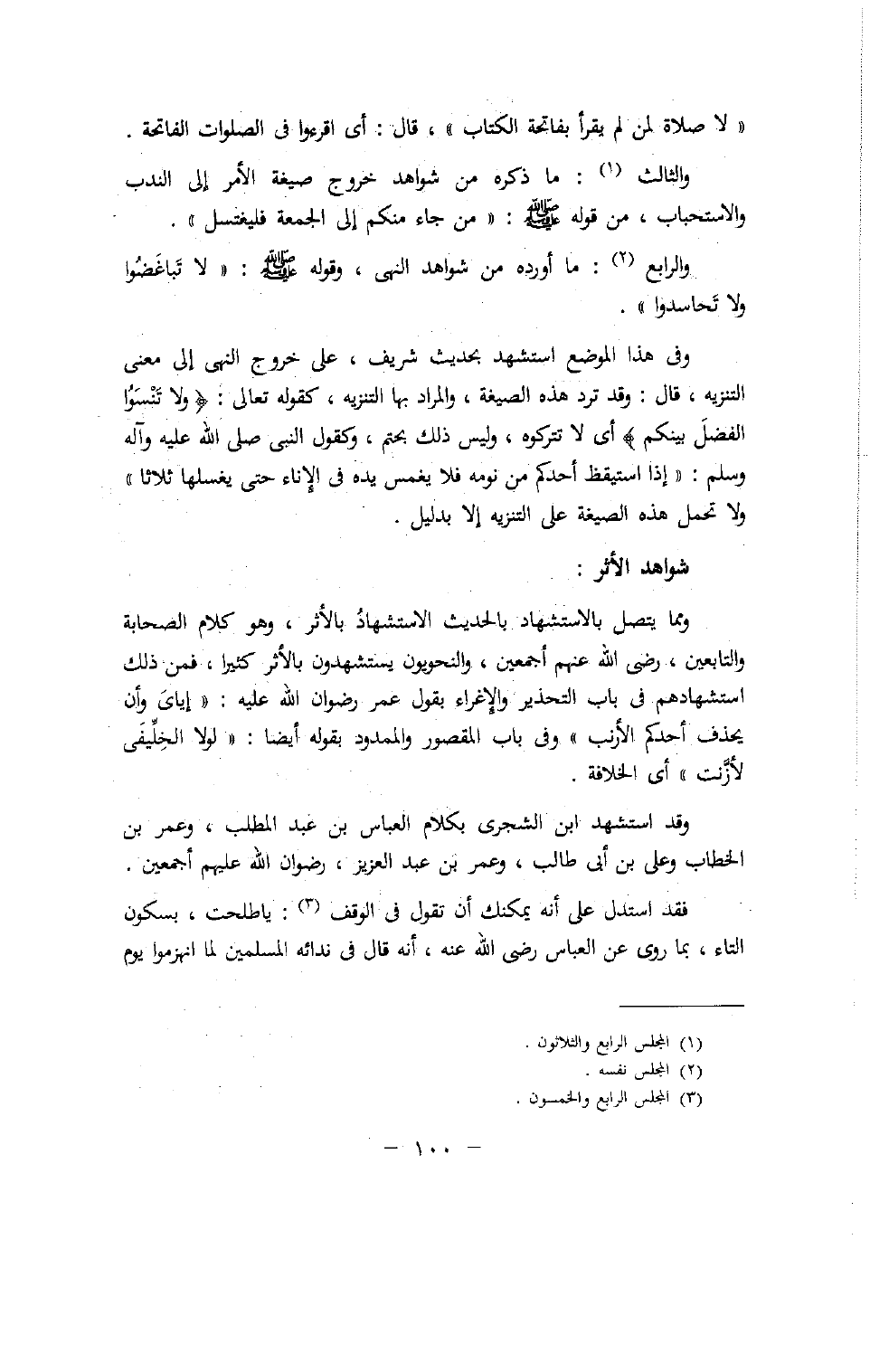 ومما يتصل بالاستشهاد بالحديث الاستشهاد بالأثر، وهو كلام الصحابة والتابعين، رضى الله عنهم أجمعين، والنحويون يستشهدون بالأثر كثيرا، فمن ذلك استشهادهم فى باب التحذير والإغراء بقول عمر رضوان الله عليه: «إياى وأن يحذف أحدكم الأرنب» وفى باب المقصور والممدود بقوله أيضا: «لولا الخلّيفى لأذّنت» أى الخلافة.