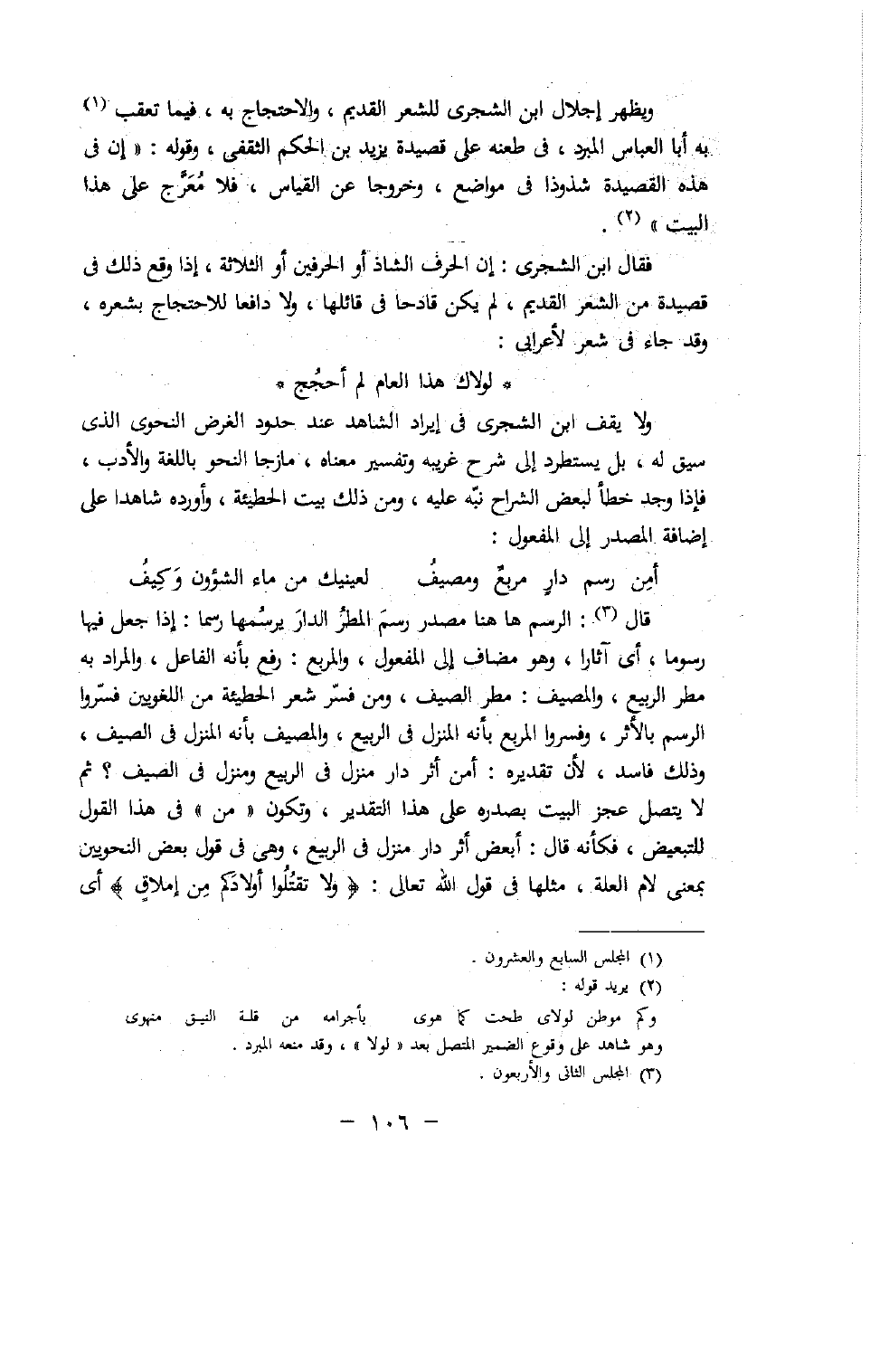 ويظهر إجلال ابن الشجرى للشعر القديم، والاحتجاج به، فيما تعقب (¬1) به أبا العباس المبرد، فى طعنه على قصيدة يزيد بن الحكم الثقفى، وقوله: «إن فى هذه القصيدة شذوذا فى مواضع، وخروجا عن القياس، فلا معرّج على هذا البيت» (¬2).