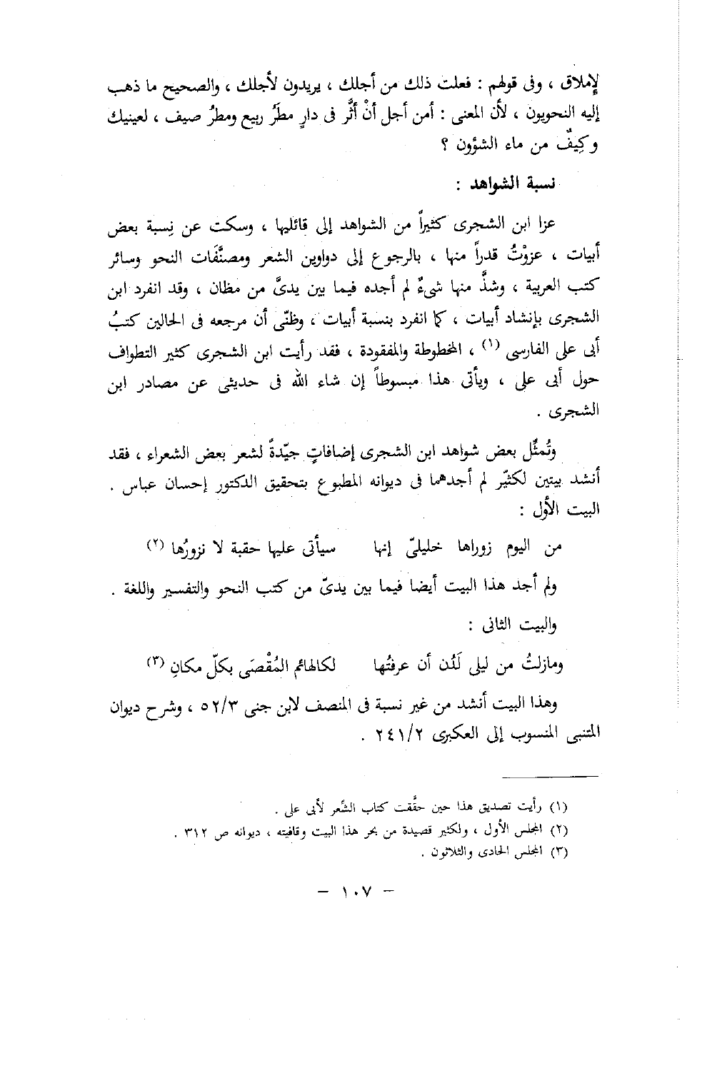 عزا ابن الشجرى كثيرا من الشواهد إلى قائليها، وسكت عن نسبة بعض أبيات، عزوت قدرا منها، بالرجوع إلى دواوين الشعر ومصنّفات النحو وسائر كتب العربية، وشذّ منها شيء لم أجده فيما بين يدىّ من مظان، وقد انفرد ابن الشجرى بإنشاد أبيات، كما انفرد بنسبة أبيات، وظنّى أن مرجعه فى الحالين كتب أبى على الفارسى (¬1)، المخطوطة والمفقودة، فقد رأيت ابن الشجرى كثير التطواف حول أبى على، ويأتى هذا مبسوطا إن شاء الله فى حديثى عن مصادر ابن الشجرى.
