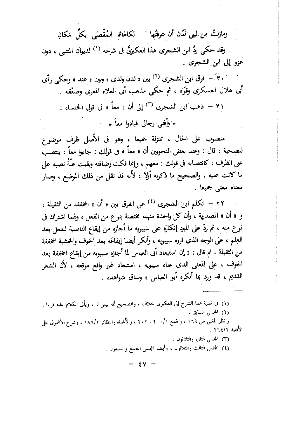 وقد حكى ردّ ابن الشجرى هذا العكبرىّ فى شرحه (¬1) لديوان المتنبى، دون عزو إلى ابن الشجرى.