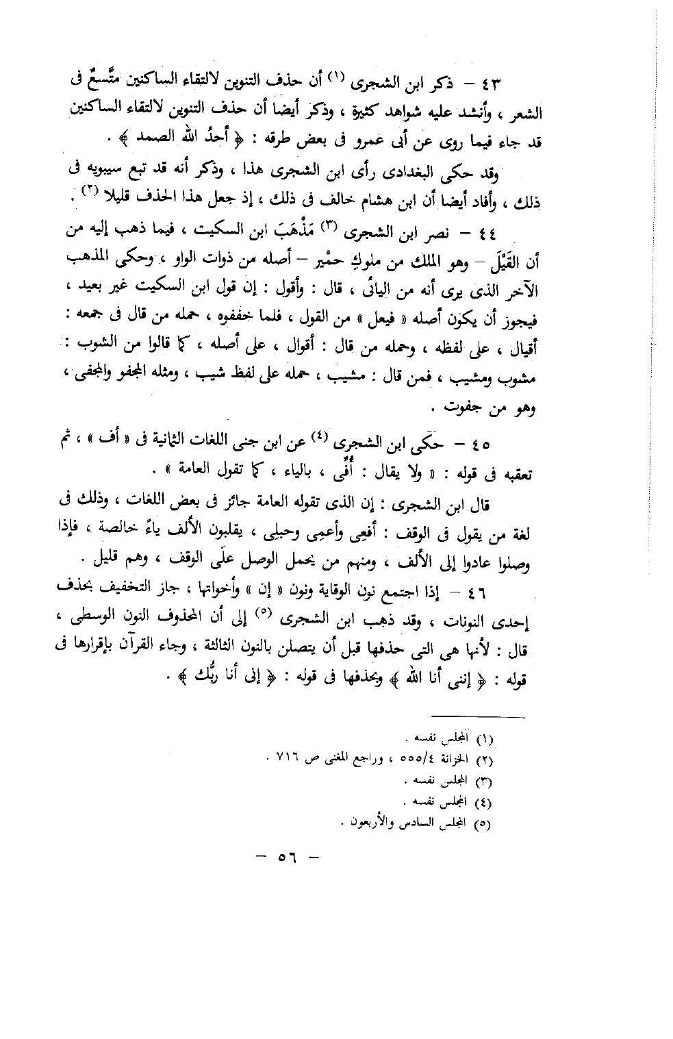 43 - ذكر ابن الشجرى (¬1) أن حذف التنوين لالتقاء الساكنين متّسع فى الشعر، وأنشد عليه شواهد كثيرة، وذكر أيضا أن حذف التنوين لالتقاء الساكنين قد جاء فيما روى عن أبى عمرو فى بعض طرقه: {أَحَدٌ اللهُ الصَّمَدُ}.