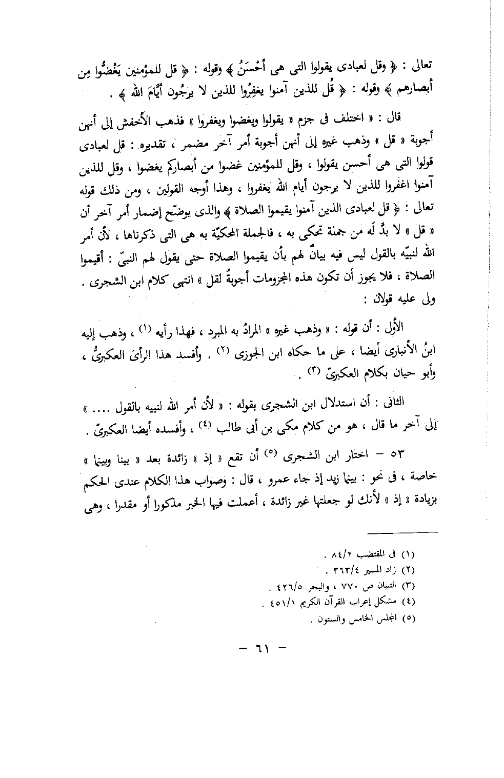 قال: «اختلف فى جزم «يقولوا ويغضوا ويغفروا» فذهب الأخفش إلى أنهن أجوبة «قل» وذهب غيره إلى أنهن أجوبة أمر آخر مضمر، تقديره: قل لعبادى قولوا التى هى أحسن يقولوا، وقل للمؤمنين غضوا من أبصاركم يغضوا، وقل للذين آمنوا اغفروا للذين لا يرجون أيام الله يغفروا، وهذا أوجه القولين، ومن ذلك قوله تعالى: {قُلْ لِعِبادِيَ الَّذِينَ آمَنُوا يُقِيمُوا الصَّلاةَ} والذى يوضّح إضمار أمر آخر أن «قل» لا بدّ له من جملة تحكى به، فالجملة المحكيّة به هى التى ذكرناها، لأن أمر الله لنبيّه بالقول ليس فيه بيان لهم بأن يقيموا الصلاة حتى يقول لهم النبىّ: أقيموا الصلاة، فلا يجوز أن تكون هذه المجزومات أجوبة لقل» انتهى كلام ابن الشجرى.