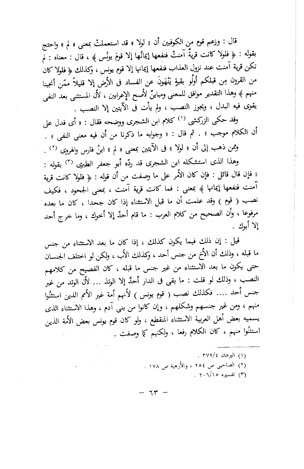 قال: وزعم قوم من الكوفيين أن «لولا» قد استعملت بمعنى «لم» واحتج بقوله: {فَلَوْلا كانَتْ قَرْيَةٌ آمَنَتْ فَنَفَعَها إِيمانُها إِلاّ قَوْمَ يُونُسَ}، قال: معناه: لم تكن قرية آمنت عند نزول العذاب فنفعها إيمانها إلا قوم يونس، وكذلك {فَلَوْلا كانَ مِنَ الْقُرُونِ مِنْ قَبْلِكُمْ أُولُوا بَقِيَّةٍ يَنْهَوْنَ عَنِ الْفَسادِ فِي الْأَرْضِ إِلاّ قَلِيلاً مِمَّنْ أَنْجَيْنا مِنْهُمْ} وهذا التقدير موافق للمعنى ومباين لأصح الإعرابين، لأن المستثنى بعد النفى يقوى فيه البدل، ويجوز النصب، ولم يأت فى الآيتين إلا النصب.