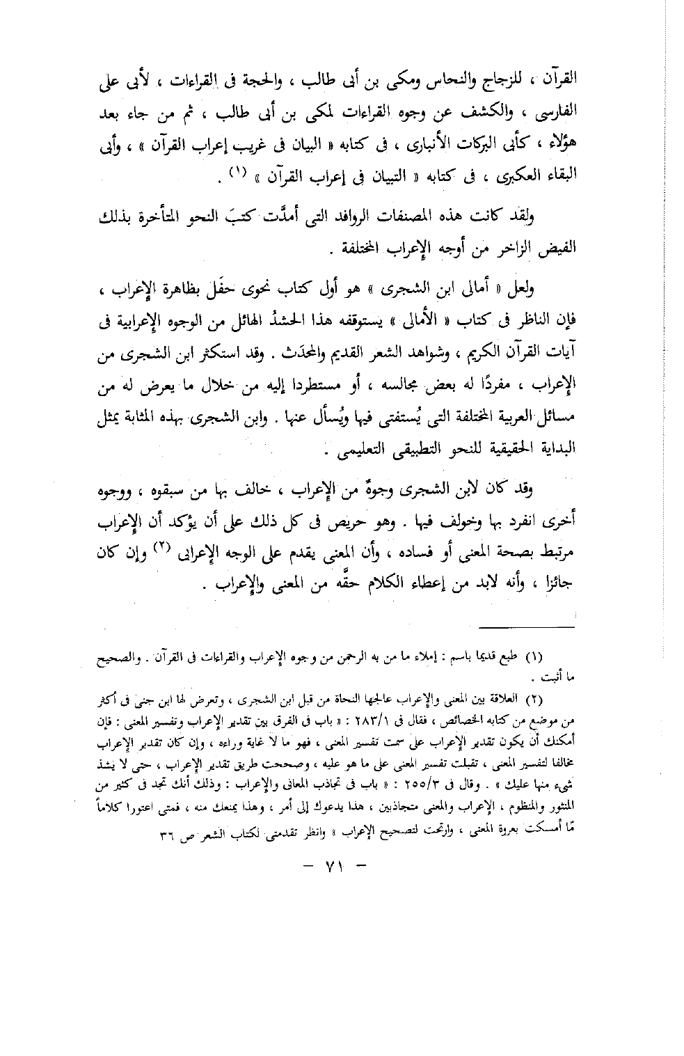 (¬2) العلاقة بين المعنى والإعراب عالجها النحاة من قبل ابن الشجرى، وتعرض لها ابن جنى فى أكثر من موضع من كتابه الخصائص، فقال فى 1/ 283: «باب فى الفرق بين تقدير الإعراب وتفسير المعنى: فإن أمكنك أن يكون تقدير الإعراب على سمت تفسير المعنى، فهو ما لا غاية وراءه، وإن كان تقدير الإعراب مخالفا لتفسير المعنى، تقبلت تفسير المعنى على ما هو عليه، وصححت طريق تقدير الإعراب، حتى لا يشذ شيء منها عليك». وقال فى 3/ 255: «باب فى تجاذب المعانى والإعراب: وذلك أنك تجد فى كثير من المنثور والمنظوم، الإعراب والمعنى متجاذبين، هذا يدعوك إلى أمر، وهذا يمنعك منه، فمتى اعتورا كلاما ما أمسكت بعروة المعنى، وارتحت لتصحيح الإعراب» وانظر تقدمتى لكتاب الشعر ص 36.
