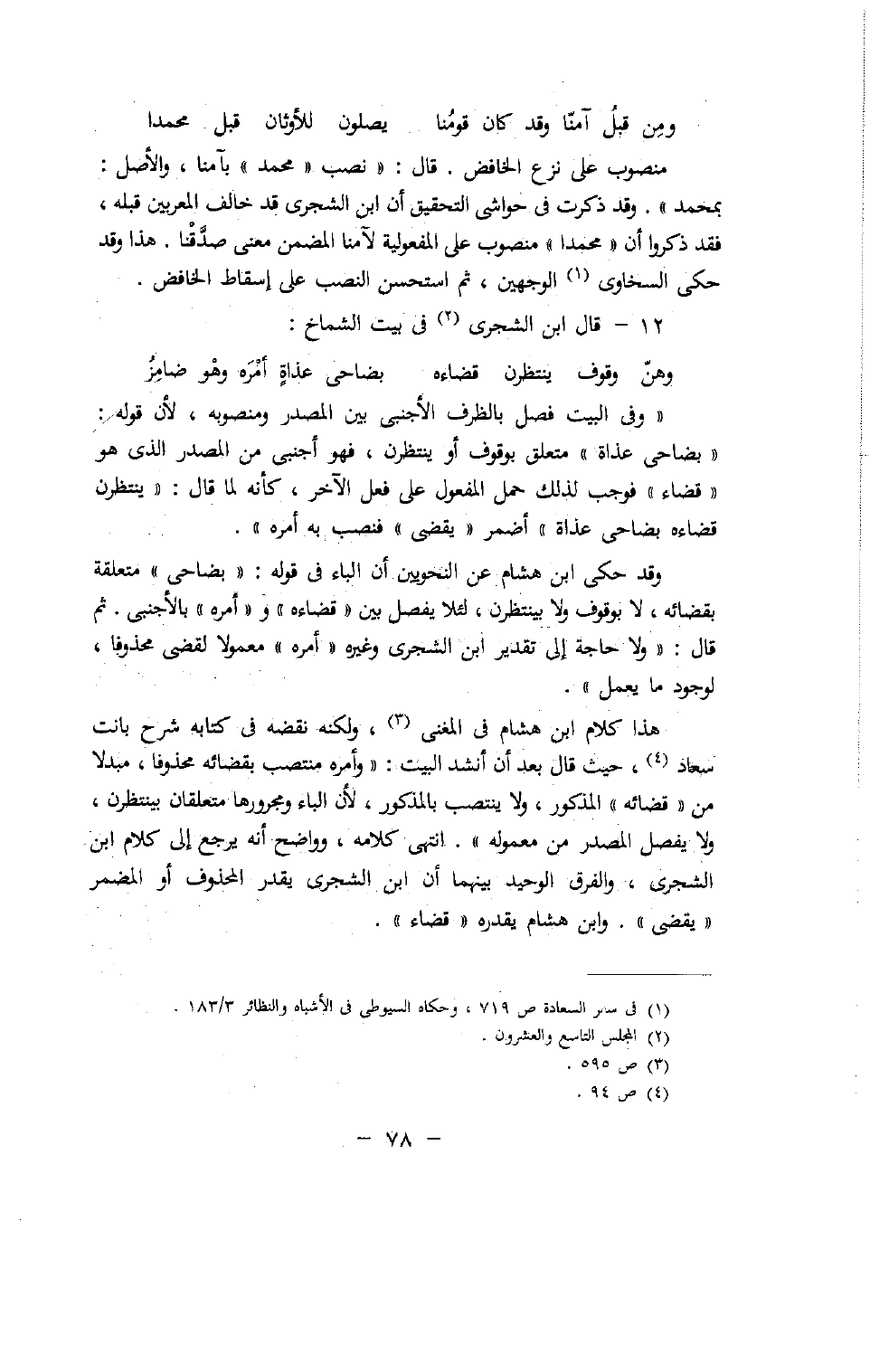 هذا كلام ابن هشام فى المغنى (¬3)، ولكنه نقضه فى كتابه شرح بانت سعاد (¬4)، حيث قال بعد أن أنشد البيت: «وأمره منتصب بقضائه محذوفا، مبدلا من «قضائه» المذكور، ولا ينتصب بالمذكور، لأن الباء ومجرورها متعلقان بينتظرن، ولا يفصل المصدر من معموله». انتهى كلامه، وواضح أنه يرجع إلى كلام ابن الشجرى، والفرق الوحيد بينهما أن ابن الشجرى يقدر المحذوف أو المضمر «يقضى». وابن هشام يقدره «قضاء».