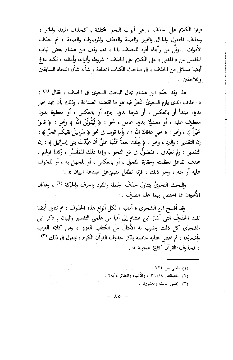 وقد أفسح ابن الشجرى «أماليه» لكل أنواع هذه الحذوف، ثم تناول أيضا تلك الحذوف التى أشار ابن هشام إلى أنها من علمى التفسير والبيان. ذكر ابن الشجرى كل ذلك وضرب له الأمثال من الكتاب العزيز، ومن كلام العرب وأشعارها، ثم اعتنى عناية خاصة بذكر حذوف القرآن الكريم، ويقول فى ذلك (¬3):