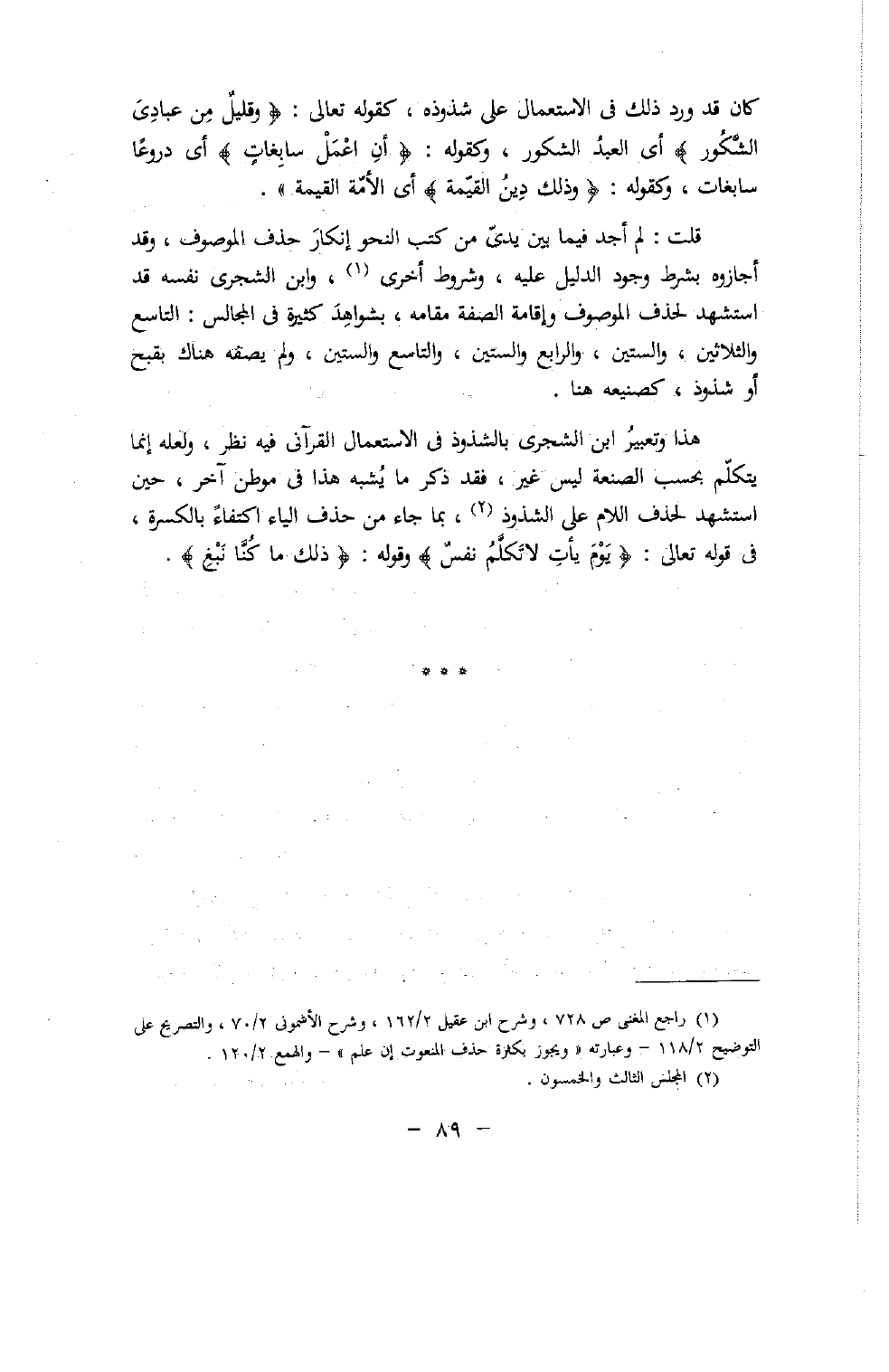 قلت: لم أجد فيما بين يدىّ من كتب النحو إنكار حذف الموصوف، وقد أجازوه بشرط وجود الدليل عليه، وشروط أخرى (¬1)، وابن الشجرى نفسه قد استشهد لحذف الموصوف وإقامة الصفة مقامه، بشواهد كثيرة فى المجالس: التاسع والثلاثين، والستين، والرابع والستين، والتاسع والستين، ولم يصفه هناك بقبح أو شذوذ، كصنيعه هنا.