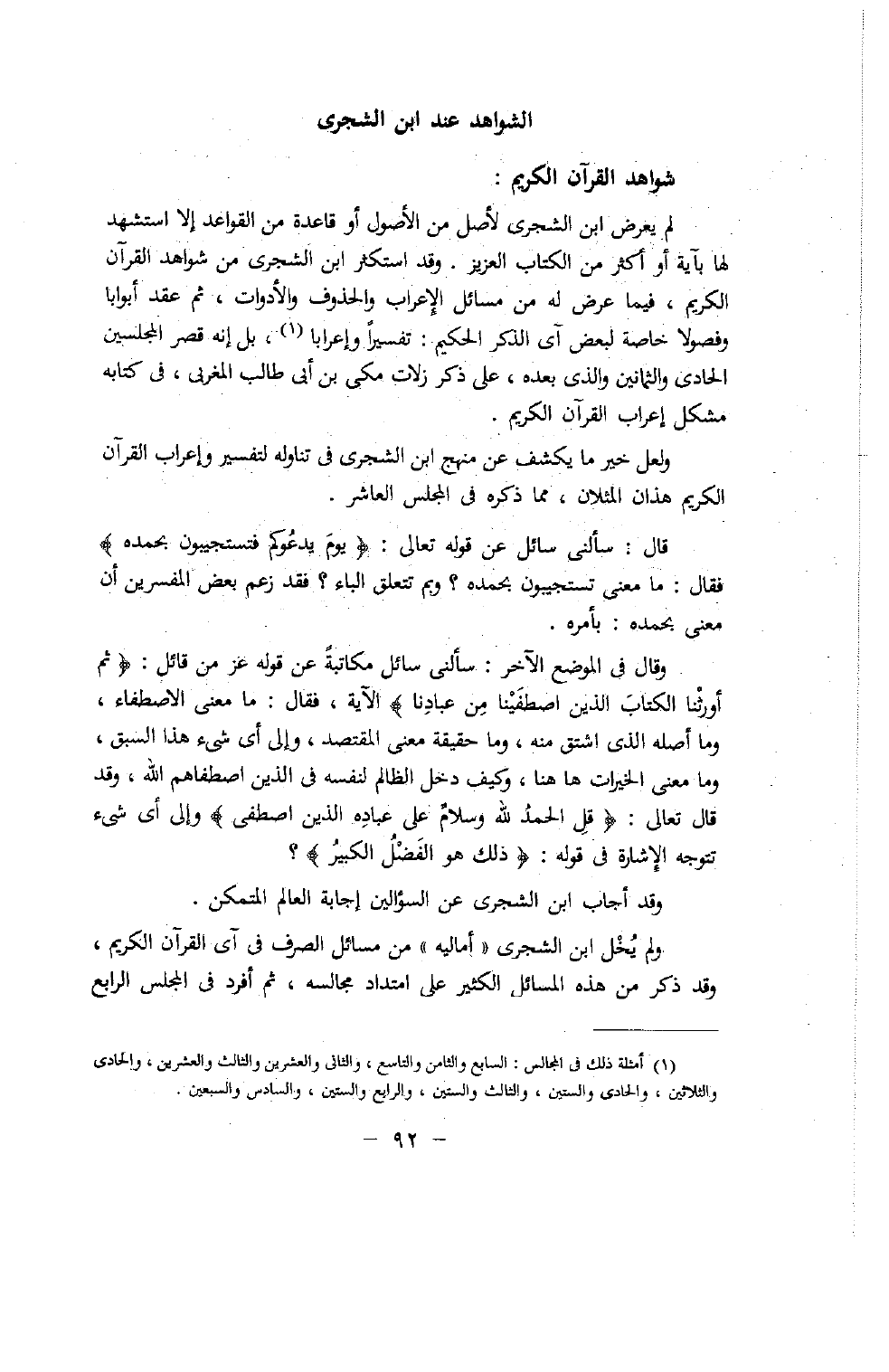 ولعل خير ما يكشف عن منهج ابن الشجرى فى تناوله لتفسير وإعراب القرآن الكريم هذان المثلان، مما ذكره فى المجلس العاشر.