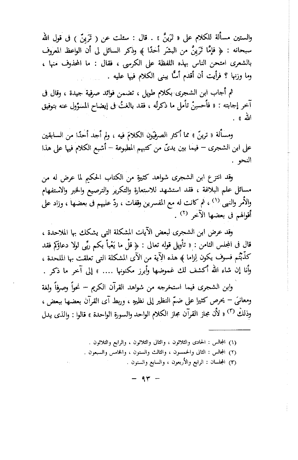ثم أجاب ابن الشجرى بكلام طويل، تضمن فوائد صرفية جيدة، وقال فى آخر إجابته: «فأحسن تأمل ما ذكرته، فقد بالغت فى إيضاح المسئول عنه بتوفيق الله».