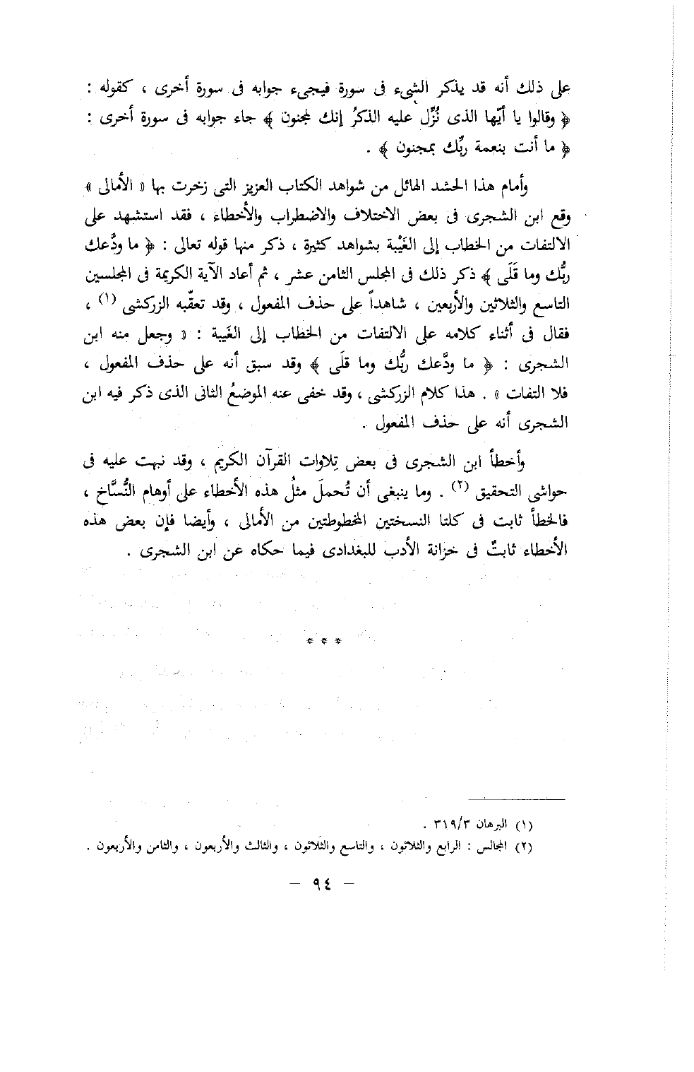 وأمام هذا الحشد الهائل من شواهد الكتاب العزيز التى زخرت بها «الأمالى» وقع ابن الشجرى فى بعض الاختلاف والاضطراب والأخطاء، فقد استشهد على الالتفات من الخطاب إلى الغيبة بشواهد كثيرة، ذكر منها قوله تعالى: {ما وَدَّعَكَ رَبُّكَ وَما قَلى} ذكر ذلك فى المجلس الثامن عشر، ثم أعاد الآية الكريمة فى المجلسين التاسع والثلاثين والأربعين، شاهدا على حذف المفعول، وقد تعقّبه الزركشى (¬1)، فقال فى أثناء كلامه على الالتفات من الخطاب إلى الغيبة: «وجعل منه ابن الشجرى: {ما وَدَّعَكَ رَبُّكَ وَما قَلى} وقد سبق أنه على حذف المفعول، فلا التفات». هذا كلام الزركشى، وقد خفى عنه الموضع الثانى الذى ذكر فيه ابن الشجرى أنه على حذف المفعول.