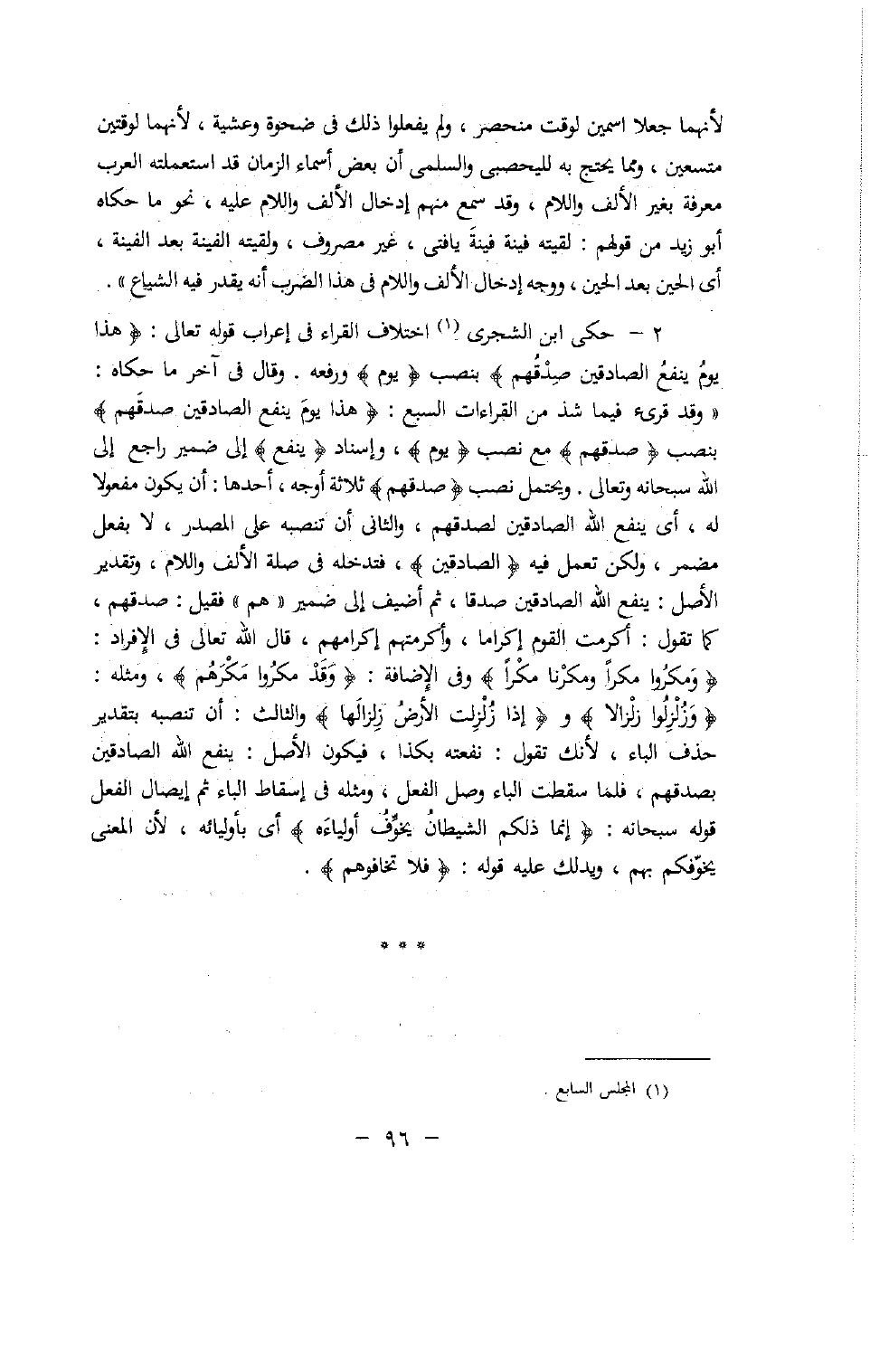 2 - حكى ابن الشجرى (¬1) اختلاف القراء فى إعراب قوله تعالى: {هذا يَوْمُ يَنْفَعُ الصّادِقِينَ صِدْقُهُمْ} بنصب {يَوْمُ} ورفعه. وقال فى آخر ما حكاه: