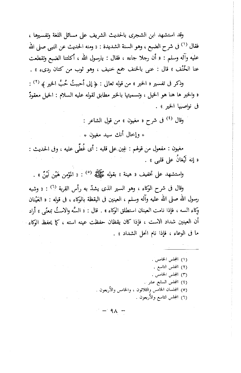 وقد استشهد ابن الشجرى بالحديث الشريف على مسائل اللغة وتفسيرها، فقال (¬1) فى شرح الضبع، وهو السنة الشديدة: «ومنه الحديث عن النبى صلى الله عليه وآله وسلم: «أن رجلا جاءه، فقال: يا رسول الله، أكلتنا الضبع وتقطعت عنا الخنف» قال: عنى بالخنف جمع خنيف، وهو ثوب من كتان رديء».