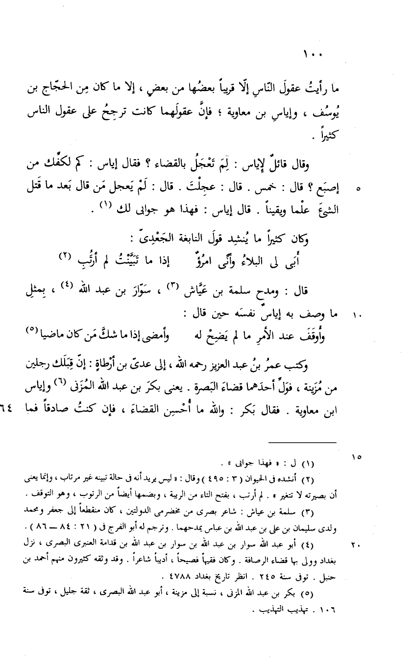 ما رأيت عقول الناس إلا قريبا بعضها من بعض إلا ما كان من عقل الحجاج بن يوسف وإياس بن معاوية فان عقولهما كانت ترجح على عقول الناس كثيرا وقال قائل لاياس لم تعجل بالقضاء فقال له إياس كم لكفك من اصبع قال خمس قال عجلت قال لم يعجل من قال بعد ما قتل الشيء علما ويقينا قال إياس فهذا هو جوابي لك وكان كثيرا ما ينشد قول النابغة الجعدي