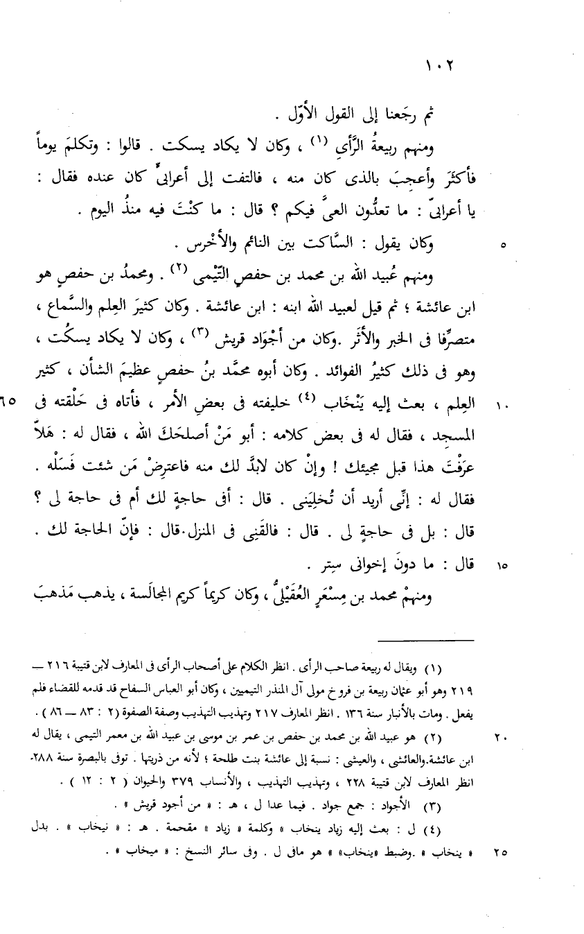 ثم رجعنا الى القول الاول ومنهم ربيعة الرأي وكان لا يكاد يسكت قالوا وتكلم يوما فأكثر وأعجب بالذي كان منه فالتفت الى اعرابي كان عنده فقال يا اعرابي ما تعدون العي فيكم قال ما كنت فيه منذ اليوم وكان يقول الساكت بين النائم والاخرس
