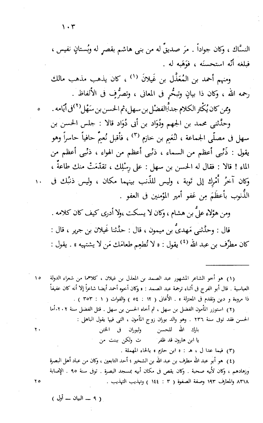 ومنهم أحمد بن المعذل بن غيلان كان يذهب مذهب مالك وكان ذا بيان وتبحر في المعاني وتصرف في الالفاظ