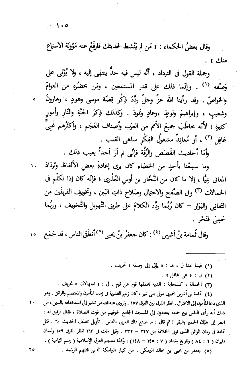 وجملة القول في الترداد انه ليس فيه حد ينتهي اليه ولا يؤتى الى وصفه وانما ذلك على قدر المستمعين له ومن يحضرة من العوام والخواص وقد رأينا الله عز و جل ردد ذكر قصة موسى وهود وهرون وشعيب وابراهيم ولوط وعاد وثمود وكذلك ذكر الجنة والنار وأمور كثيرة لانه خاطب جميع الامم من العرب وأصناف العجم واكثرهم غبي غافل او معاند مشغول الفكر ساهي القلب واما حديث القصص والرقة فاني لم أر احدا يعيب ذلك وما سمعناه بأحد من الخطباء كان يرى إعادة بعض الالفاظ وترداد المعاني عيا إلا ما كان من النخار بن أوس العذري فانه كان إذا تكلم في الحمالات وفي الصفح