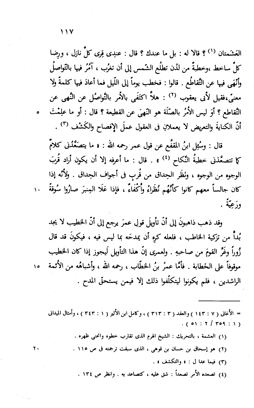 قال وسئل ابن المقفع عن قول عمر بن الخطاب رضي الله عنه ما يتصعدني كلام كما تصعدني خطبة النكاح قال ما أعرفه الا ان يكون اراد قرب الوجوه من الوجوه ونظر الحداق من قرب في اجواف الحداق ولانه اذا كان جالسا معهم كانوا كأنهم نظراء وأكفاء واذا علا المنبر صاروا سوقة ورعية وقد ذهب ذاهبون الى ان تأويل قول عمر يرجع الى ان الخطيب لا يجد بدا من تزكية الخاطب فلعله كره ان يمدحه بما ليس فيه فيكون قد قال زورا وغر القوم من صاحبه ولعمري ان هذا التأويل ليجوز اذا كان الخطيب موقوفا على الخطابة فأما عمر بن الخطاب رضي الله عنه وأشباهه من الأئمة الراشدين رضوان الله تعالى عليهم اجمعين فلم يكونوا ليتكلفوا ذلك الا فيمن يستحق المدح@