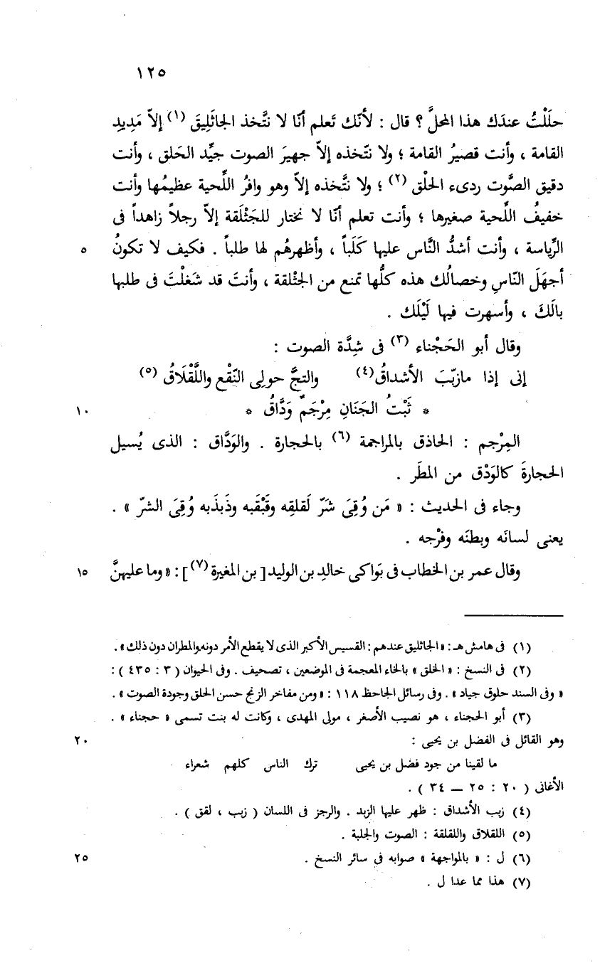 قصير القامة ولا نتخذه الا جهير الصوت جيد الخلق وأنت دقيق الصوت رديء الخلق ولا نتخذه الا وهو وافر اللحية عظيمها وانت خفيف اللحية صغيرها وانت تعلم أنا لا نختار للجثلقة الا رجلا زاهدا في الرياسة وأنت أشد الناس عليها كلبا وأظهرهم لها طلبا فكيف لا تكون أجهل الناس وخصالك هذه كلها تمنع من الجثلقة وأنت قد شغلت في طلبها بالك وأسهرت فيها ليلك وقال ابو الحجناء في شدة الصوت