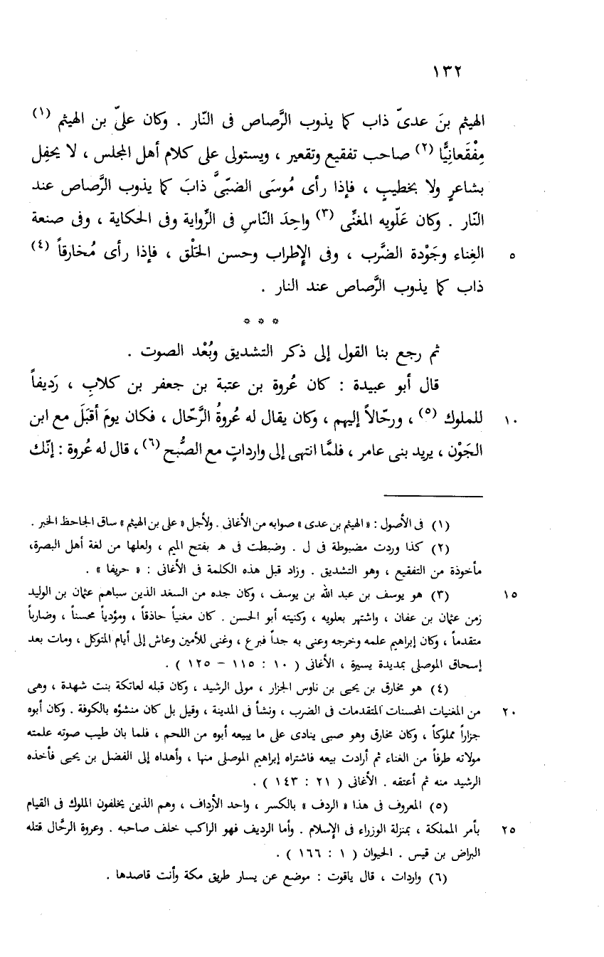 الهيثم ابن عدي ذاب كما يذوب الرصاص عند النار وكان الهيثم بن عدي مفقعا نيا صاحب تفقيع وتقعير ويستولي على كلام اهل المجلس لا يحفل بشاعر ولا بخطيب فاذارأى موسى الضبي ذاب كما يذوب الرصاص عند النار وكان علويه المغني احد الناس في الرواية وفي الحكاية وفي صنعة الغناء وجودة الضرب وفي الاطراب وحسن الخلق فاذا رأى مخارقا ذاب كما يذوب الرصاص عند النار