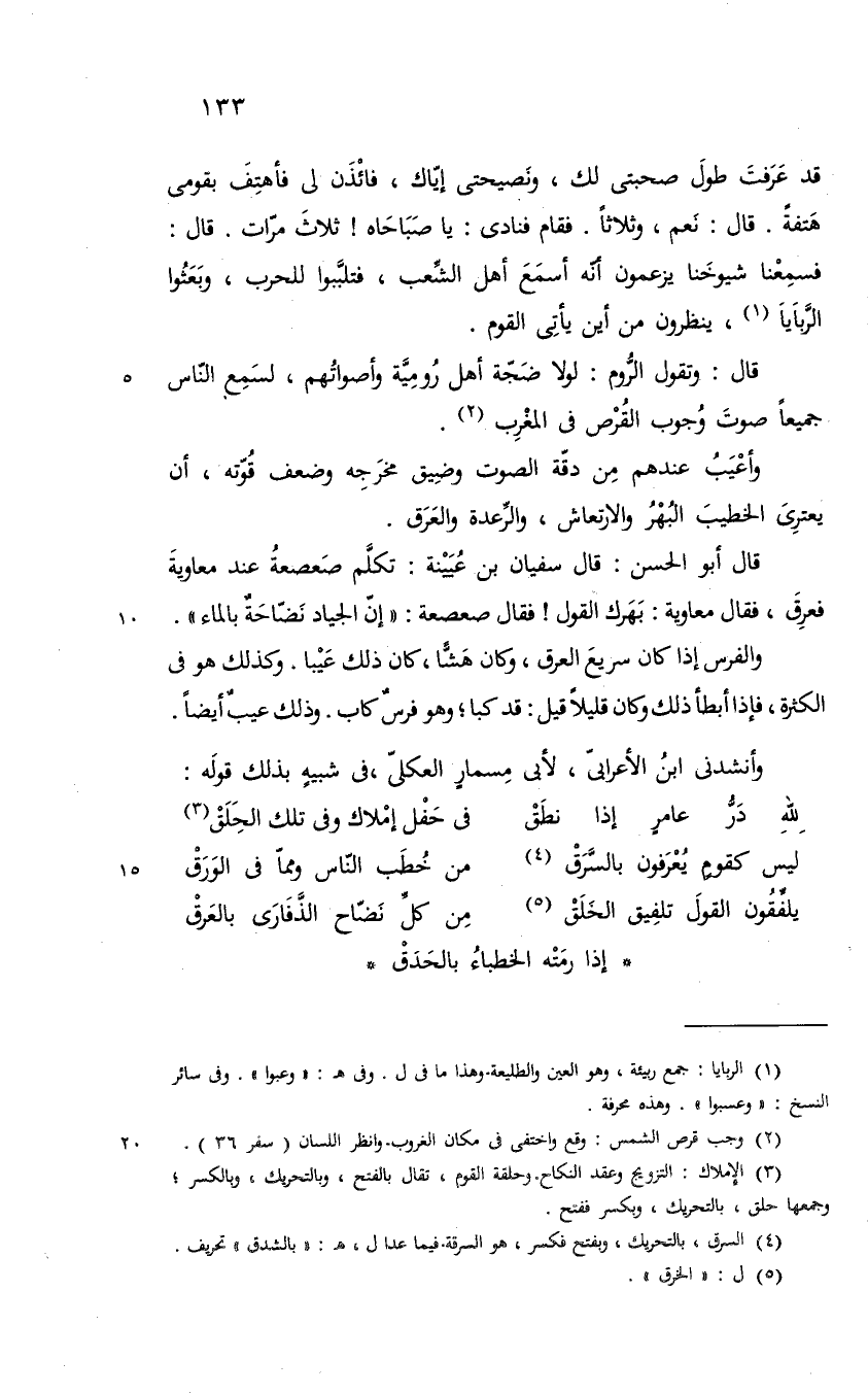 قد عرفت طول صحبتي لك ونصيحتي اياك فأذن لي فأهتف بقومي هتفة قال نعم وثلاثا فقام فنادى يا صاحباه ثلاث مرات قال فسمعنا شيوخنا يزعمون انه اسمع اهل الشعب فتلببوا للحرب وعسبوا الربايا ينظرون من أين يأتي القوم قالوا وتقول الروم لولا ضجة أهل رومية وأصواتهم لسمع الناس جميعا صوت وجوب القرص في المغرب
