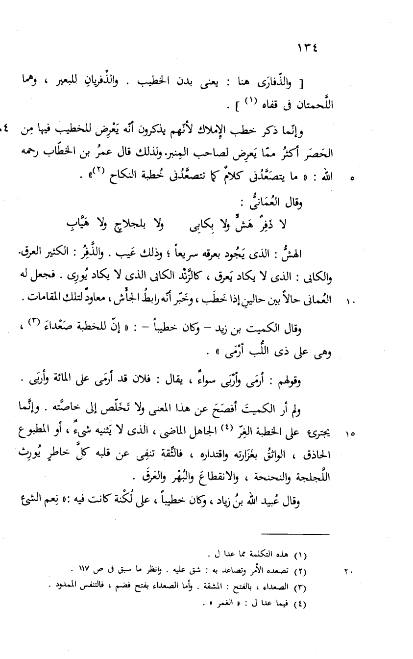 وقولهم أرمى وأربى سواء يقال فلان قد أرمي على المائة وأربى ولم أر الكميت افصح عن هذا المعنى ولا تخلص الى خاصته وانما يجترىء علىالخطبة الغمر الجاهل الماضي الذي لا يثنيه شيء او المطبوع الحاذق الواثق بغزارته واقتدراه فالثقة تنفي عن قلبه كل خاطر يورث اللجلجة والنحنحة والانقطاع والبهر والعرق