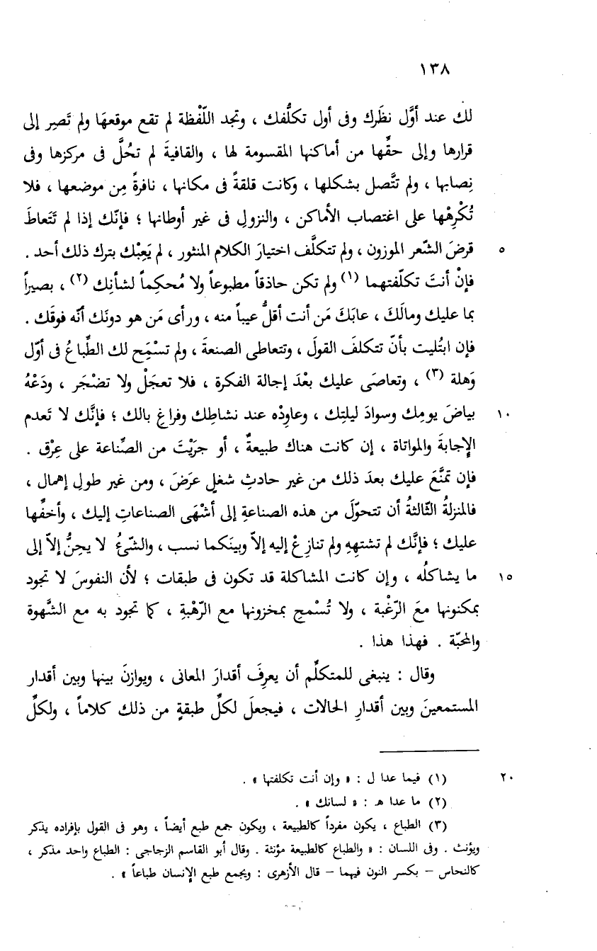 لك عند اول نظرك وفي اول تكلفك وتجد اللفظة لم تقع موقعها ولم تصر الى قرارها والى حقها من اماكنها المقسومة لها والقافية لم تحل في مركزها وفي نصابها ولم تصل بشكلها وكانت قلقة في مكانها نافرة من موضعها فلا تكرهها على اغتصاب الاماكن والنزول في غير اوطانها فانك اذا لم تتعاط قرض الشعر الموزون ولم تتكلف اختيار الكلام المنثور لم يعبك بترك ذلك احد وان انت تكلفتها ولم تكن حاذقا مطبوعا ولا محكما لسانك بصيرا مما عليك او مالك عابك من انت اقل عيبا منه ورأى من هو دونك انه فوقك فان ابتليت بان تتكلف القول وتتعاطى الصنعة ولم تسمح لك الطباع في اول وهلة وتعصى عليك بعد إجالة الفكرة فلا تعجل ولا تضجر ودعه بياض يومك أوسواد ليلك وعاوده عند نشاطك وفراغ بالك فانك لا تعدم الاجابة والمواتاة ان كانت هناك طبيعة او جريت من الصناعة على عرق فان تمنع عليك بعد ذلك من غير حادث شغل عرض ومن غير طول اهمال فالمنزلة الثالثة ان تتحول من هذه الصناعة الى اشهى الصناعات اليك واخفها عليك فانك لم تشتهه ولم تنازع اليه الا وبينكما نسب والشيء لا يحن الا الى ما يشاكله وان كانت المشاكلة قد تكون في طبقات لان النفوس لا تجود بمكنونها مع الرغبة ولا تسمح بمخزونها مع الرهبة كما تجود به مع المحبة والشهوة فهكذا هذا