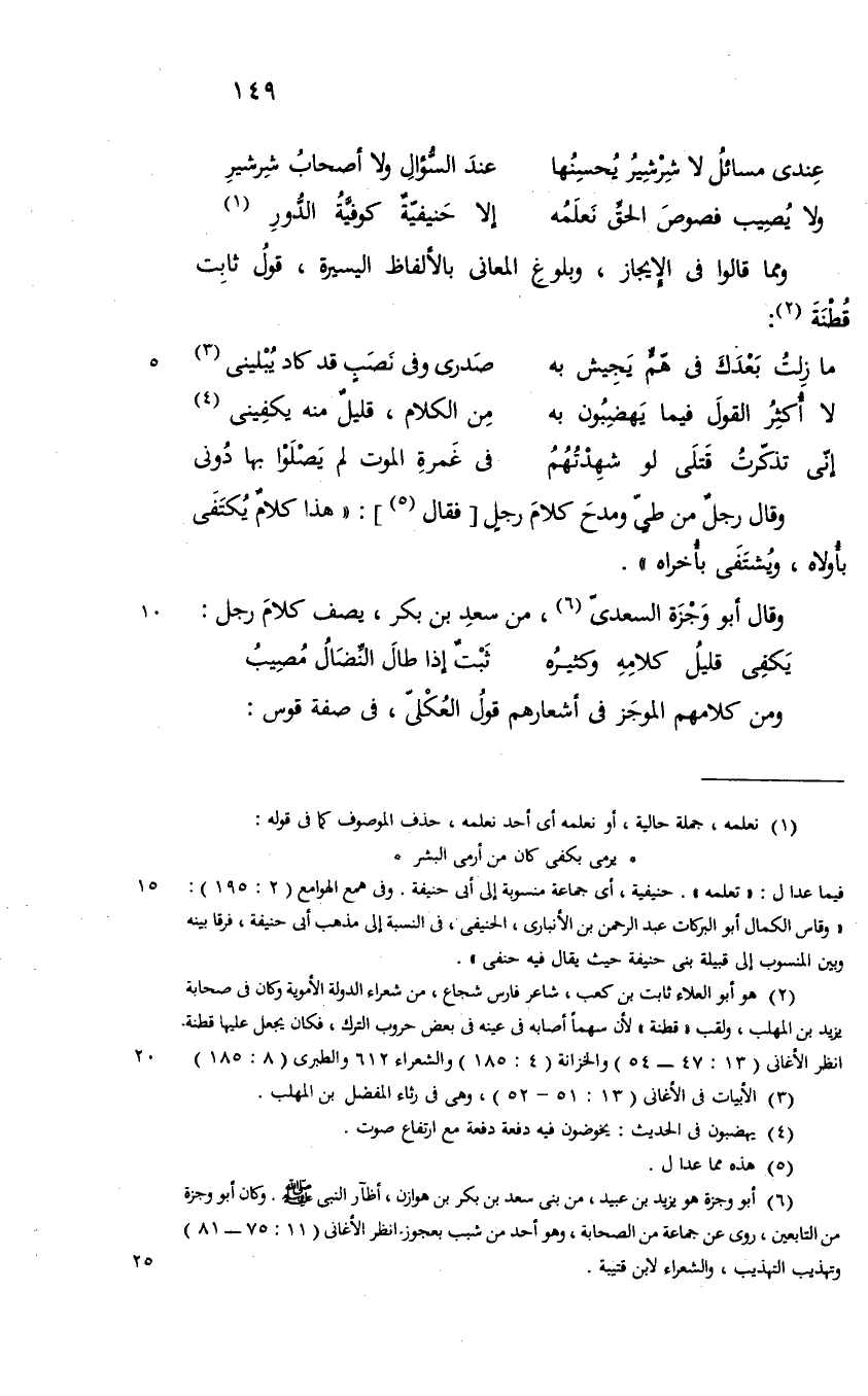 وقال رجل من طيء ومدح كلام رجل فقال هذا كلام يكتفي بأولاه ويشتفي بآخره وقال ابو وجرة السعدي من سعد بن بكر يصف كلام رجل